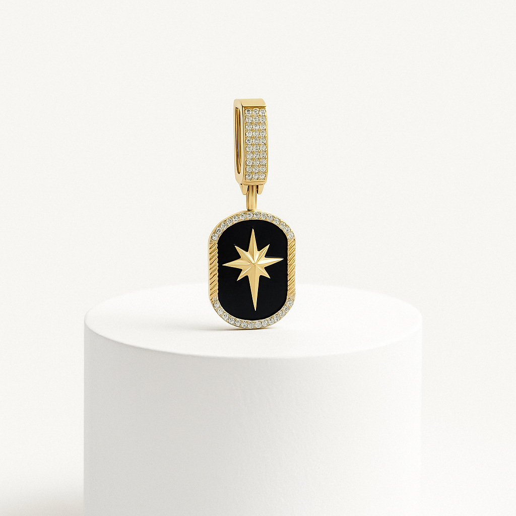 Gökyüzünün pusulası kulağınızda: Lumin Pendant Küpe. Işığı yakalayan siyah zemin, derin bir gece hissi uyandırırken ortadaki sekiz kollu yıldız her dönüşünüzde parlak bir odak oluşturur. Çerçeveyi saran mikro pavé kristaller, ince altın tonlu halkayla birleşerek tasarıma bir “halo” ışıltısı katar. Hafif dikdörtgen form, gün boyu rahat taşınır; gizli menteşeli klips ise tek dokunuşta sabitlenir, iz bırakmaz. Gündüz denim-blazer ikilisine modern sofistike bir dokunuş, gece davet elbisesine kozmik bir imza… Lumin Pendant, karanlıkta bile parlayacak özgüveni simgeler.