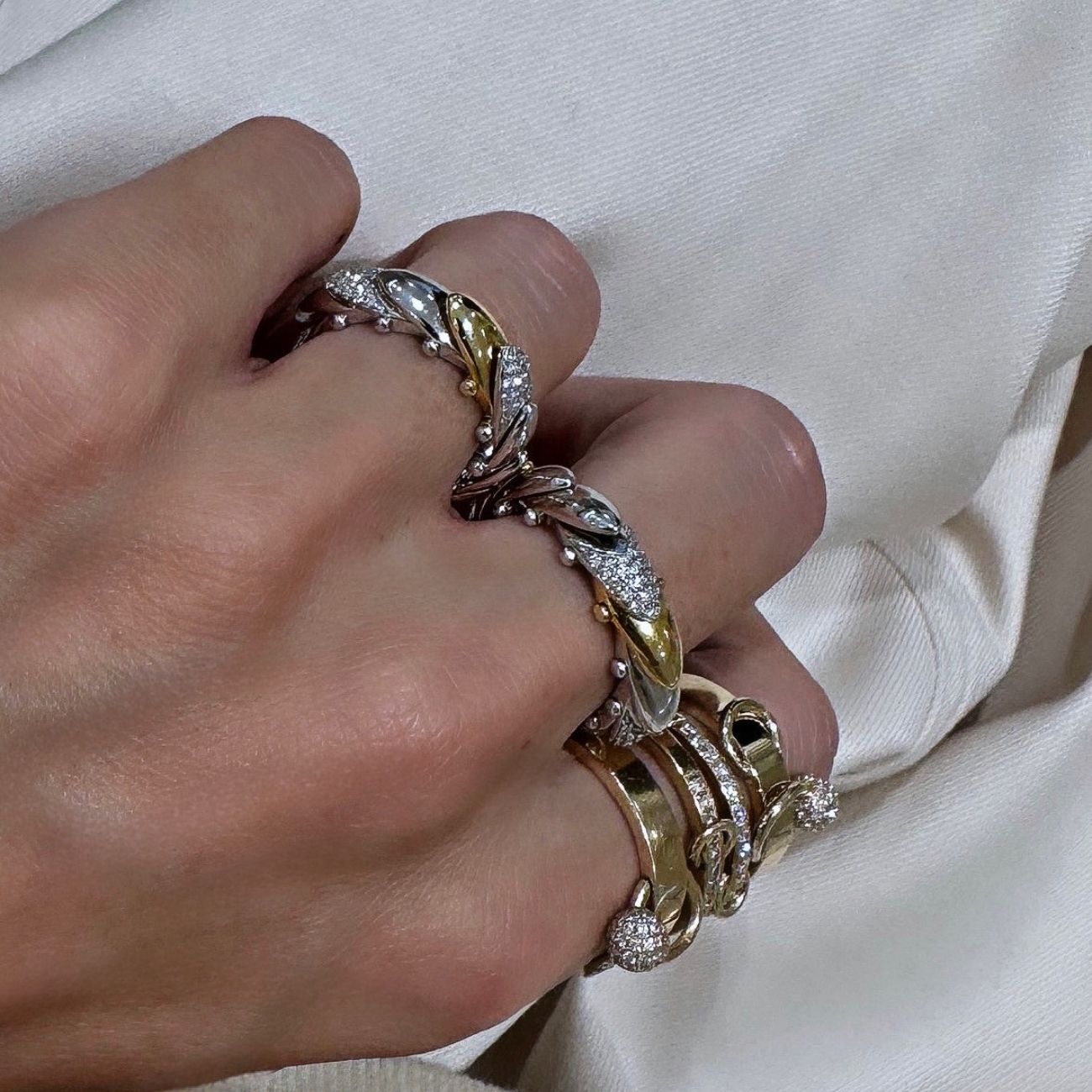 Lustra Flow Yüzük, akıcı hatları ve modern tasarımıyla zarafeti en şık şekilde yansıtır. Beyaz ve altın tonlarının kusursuz birleşimi, pırlanta detaylarla buluşarak göz alıcı bir ışıltı yaratır. Hem günlük kullanıma hem de özel davetlere uyum sağlayan bu yüzük, stiline sofistike bir dokunuş katmak isteyenler için ideal bir seçimdir.