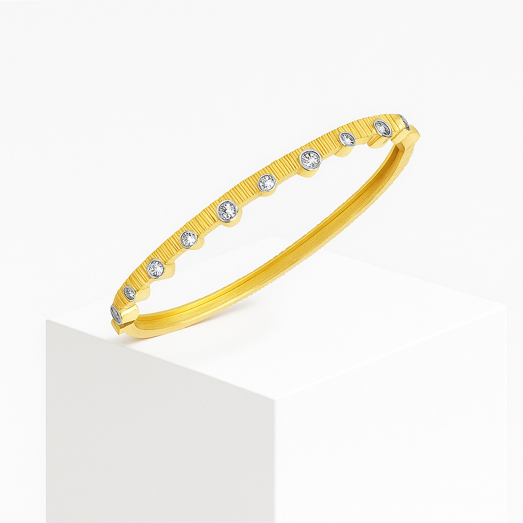 Kelepçenin ince çizgisel dokusu, tasarıma modern bir doku katarken; simetrik taş dizilimi sofistike bir denge hissi oluşturur. Hafif yapısı ve konforlu yapısı sayesinde bileğinizde zarif bir tamamlayıcı olarak gün boyu rahatça taşınabilir.