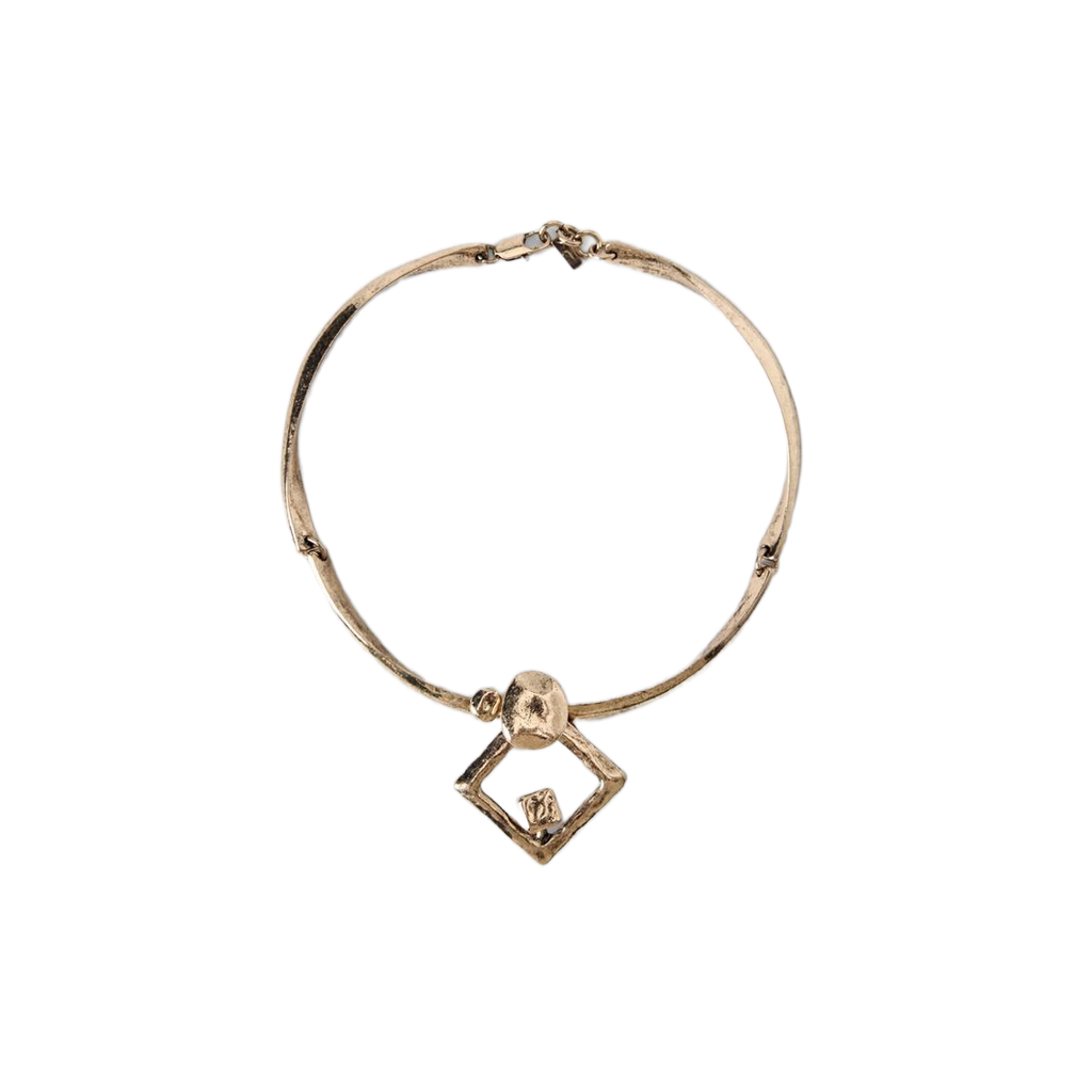 Minimal geometrik hatlarla çağdaş bir duruş sergileyen bu tasarım, heykelsi formu ve mat altın dokusuyla adeta modern bir sanat eserini andırır. Merkezdeki kare ve küre detayları, geçmişin sembolik estetiğini günümüzün zarif çizgileriyle buluşturur. Modern Relic Kolye, sade ama iddialı bir stil arayanlar için kusursuz bir seçimdir.