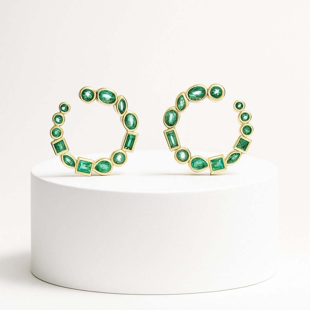 Zümrüdün tek bir kesime boyun eğmediği, yeşilin her tonunun altın bir dairede dans ettiği bir mücevher mozaiği… Kareden baguette’e, ovalden markize uzanan taşlar özenle dizilerek kusursuz bir çember oluşturur; sanki elinizde döndürdüğünüzde Anadolu’nun çinilerinden, Gaudí’nin kırık seramiklerinden yansıyan o canlı ritim kulağınıza taşınmış gibi.
