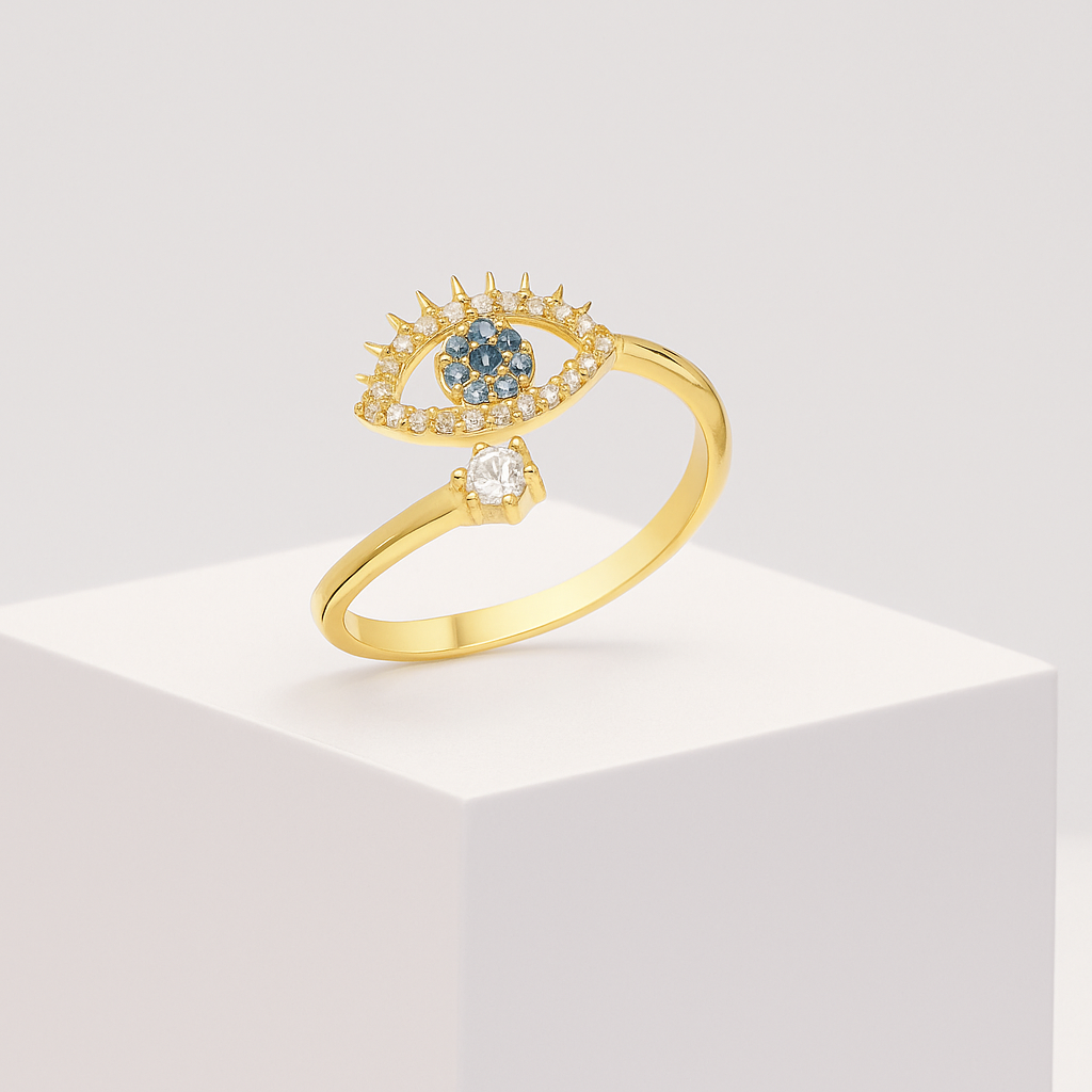 Mystic Iris Yüzük, kadim sembollerin modern tasarımla buluştuğu mistik bir stil ifadesidir. Merkezde yer alan nazar boncuğu formundaki mavi taş, negatif enerjilere karşı sembolik bir koruma sağlarken; altın tonlu zarif çerçevesiyle günümüz estetiğine kusursuzca uyum sağlar.