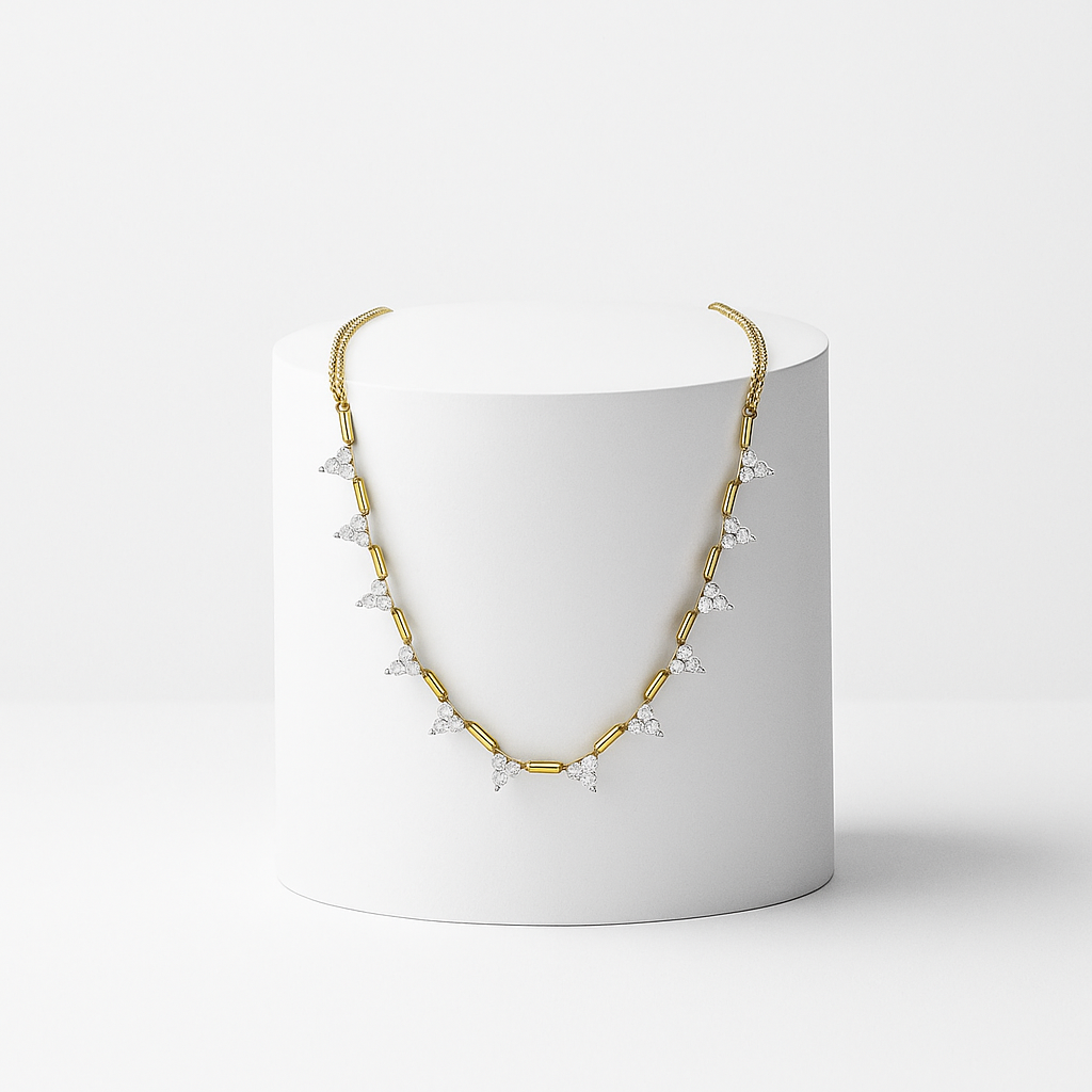 Nuvéa Line Kolye, zarafeti geometrik dengeyle buluşturan incelikli bir tasarım anlayışının yansımasıdır. Üçgen kesimli taşların ritmik aralıklarla dizilimi, ince silindirik bağlantılarla buluşarak boyun hattında akıcı ve dengeli bir hareket oluşturur. Her bir taş, ışığı keskin ama yumuşak bir geçişle yansıtır; bu da kolyeye sadece bir ışıltı değil, aynı zamanda belirgin bir duruş kazandırır.
