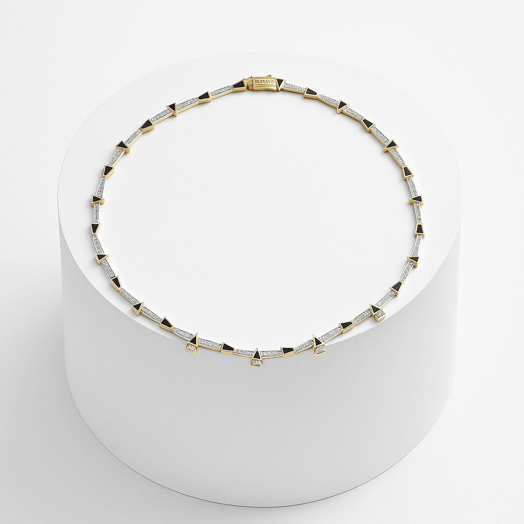 Boyunda hafifçe süzülen bu özel tasarım, her hareketle ışığı yansıtır; modern formlar ile klasik ihtişamı buluşturur. Her detayı; zarif, dengeli ve sofistike bir stilin yansımasıdır.