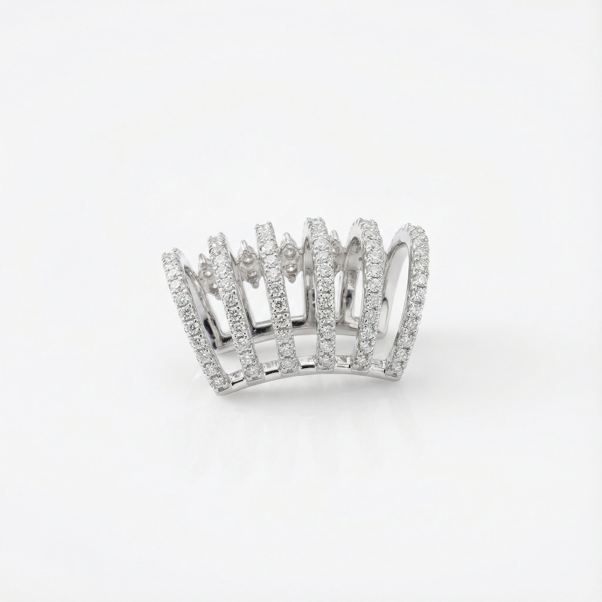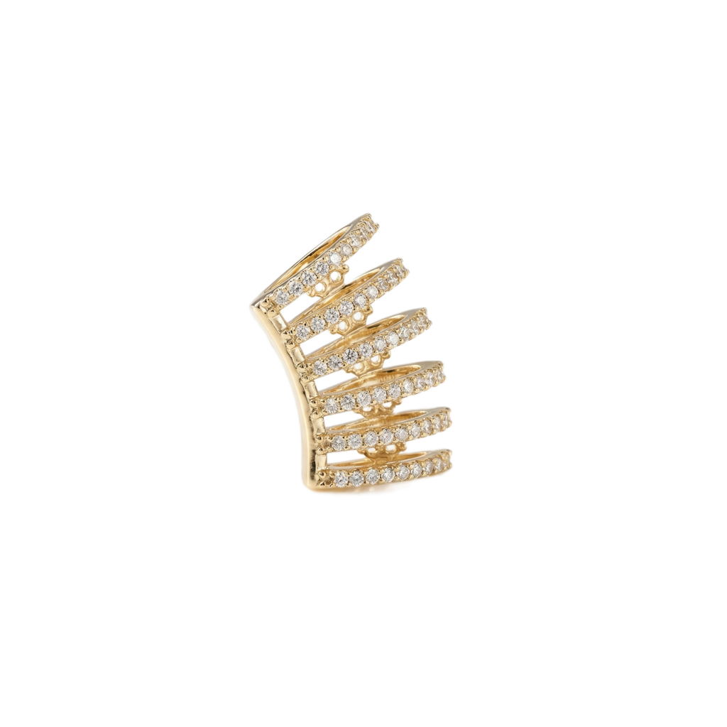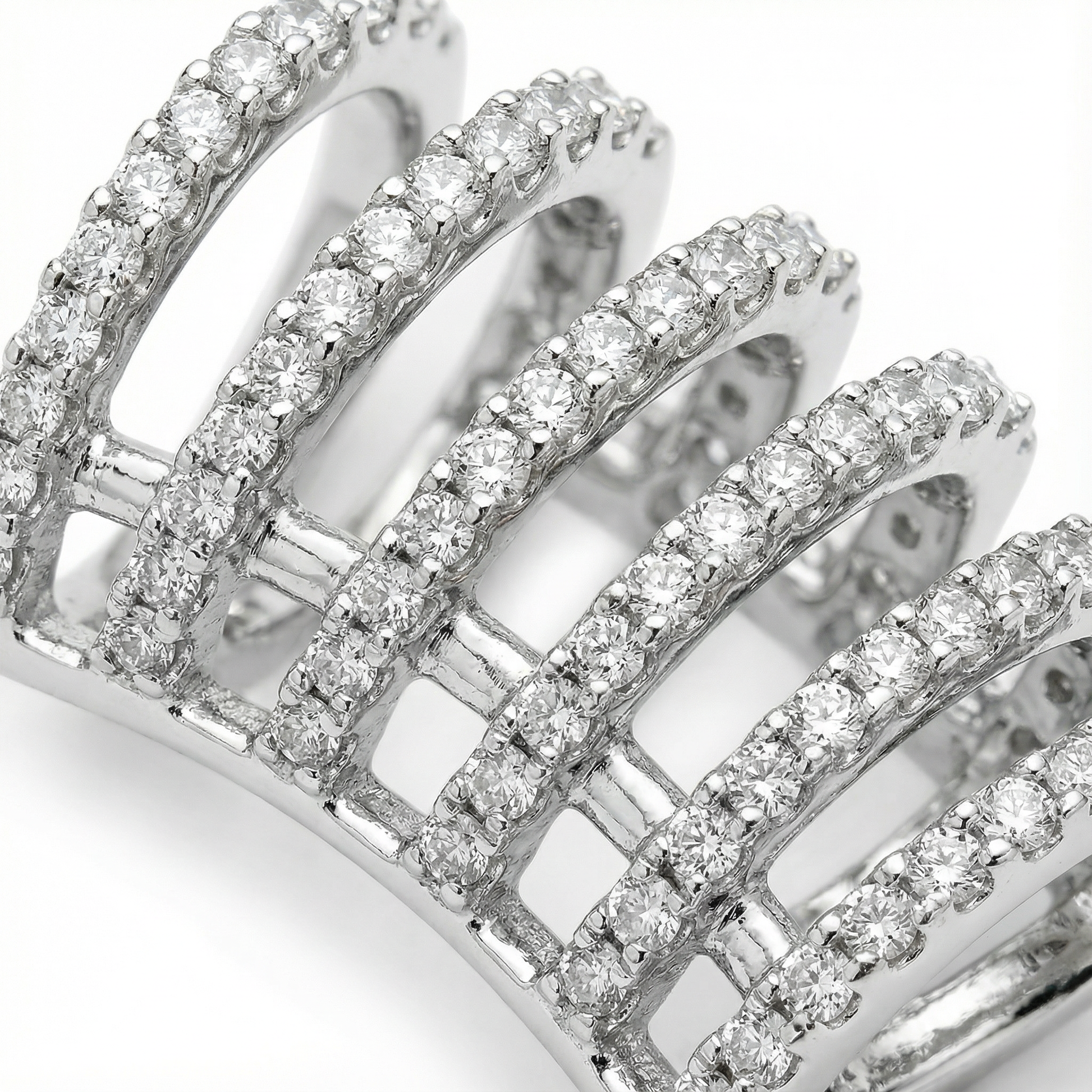 Architectural Brilliance in Alignment The Prism Tier Ear Cuff is a masterclass in structural elegance and linear precision. Crafted in luminous silver, this bold statement piece features seven perfectly parallel tiers, each meticulously encrusted with high-density pavé crystals. The open-frame architecture allows the cuff to wrap the ear in a shimmering crystalline cage, creating a high-impact, multi-layered look without the need for multiple piercings. It is the ultimate accessory for the modern vanguard who seeks to blend industrial-chic design with timeless red-carpet glamour.