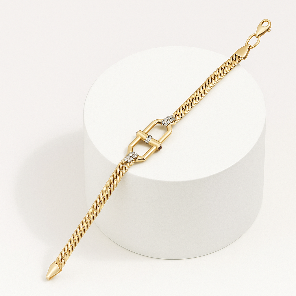 Altın tonlu ince örgü, bileğinizde ipek gibi kıvrılır; her tel, ışığı mozaik parçaları gibi yansıtarak sıcak bir parıltı yaratır. Dokunun sonunda yer alan kiremit kırmızısı taş—güçlü bir son nota gibi—bütün bakışları kilitler. Adını aldığı yalın kilit mekanizması tek hamlede kapanır, gün boyu oynama yapmadan durur.