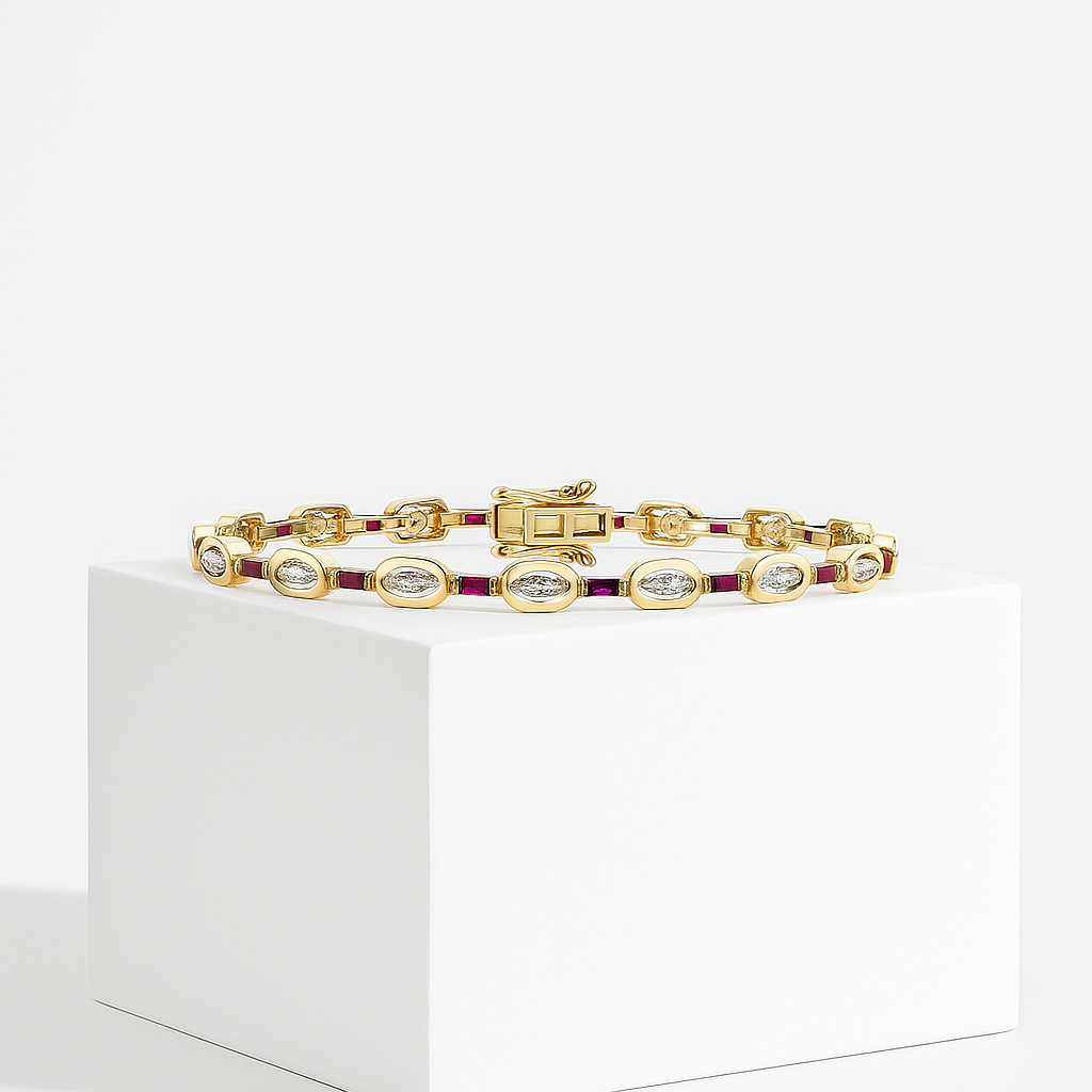 Rouge Lumière Bileklik, bileği ince bir altın hattıyla sararken her oval halkada göz biçiminde markiz ışıltı barındırır; iki halkanın arasına yerleştirilen parlak rubis bagetler, karmin bir ışık akışı yaratır. Zincirin akıcı formu gün ışığında zarif bir kıvılcım, gece spotlarında ise baş döndüren bir alev gibi titreşir. Şehir ofisinde sade bir ipek gömlekle çabasız şıklık katarken, akşam davetinde couture bir elbiseyle bilekte modern bir mücevher imzasına dönüşür. İnce tokası, Rouge Lumière’i gün boyu sabit tutar; fakat asıl etki, her hareketinizde görünen yakut kırmızısının tutkulu enerjisinde saklıdır.