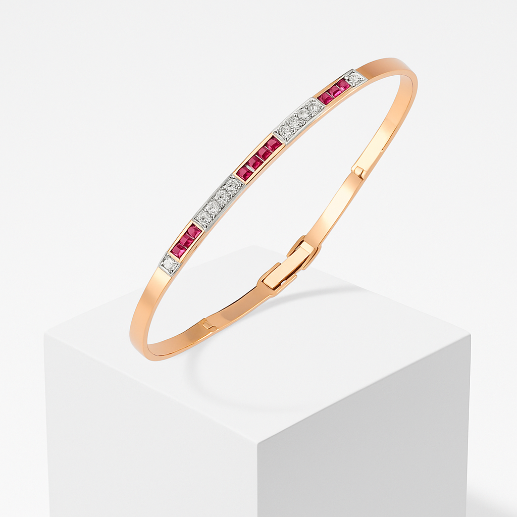 Saf çizginin ateşle buluştuğu nokta—Ruby Rail, bileğin üzerine kızıl bir imza atıyor. İnce rose gövdeyi kesintisiz bir ray gibi yaran yakut şerit, yanındaki buz berraklığındaki taşlarla dramatik bir karşıtlık kuruyor; sakin parıltı değil, bilinçli bir parlama. Minimal hacmi, klasik bilekliklere meydan okurken avuç içine neredeyse ağırlıksız oturur; ipek bir gömleğin manşetinden sızan kırmızı ışıltı ya da gece elbisesiyle tam doz cesaret… İster tek kullan, ister kolundaki stack’in merkezine yerleştir—Ruby Rail, çizgisini bozmayanların net beyanı: kırmızı çizgin ateşse, onu bileğinde taşımaktan korkma.