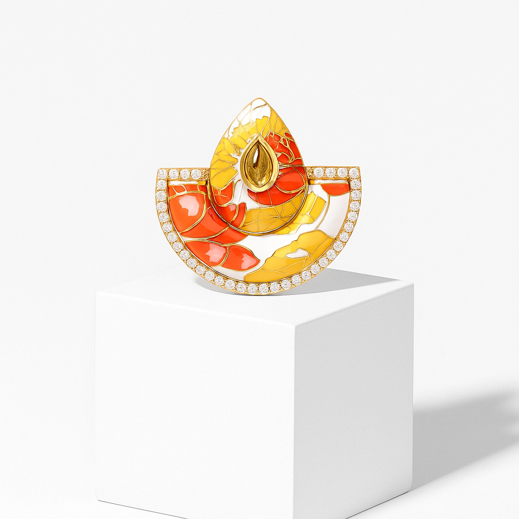 Günbatımının en canlı anı, yarı daire formunda bir yelpaze gibi kulaklarınıza konuyor. El işçiliği mine panelleri, safran sarısından ateş kırmızısına uzanan degradeyle egzotik bir çiçek deseni yaratır; orta noktada yükselen armut kesim sitrin, ışığı adeta güneşin son parıltısı gibi yakalar. Ürün eş içliğiyle üretilmiş olup mine detayları farklılık yaratır. Çerçeveyi saran mikro pavé taş şeridi, renk fırtınasını narin bir ışıltı kemeriyle tamamlar ve tasarıma sahne ışığı efekti verir.