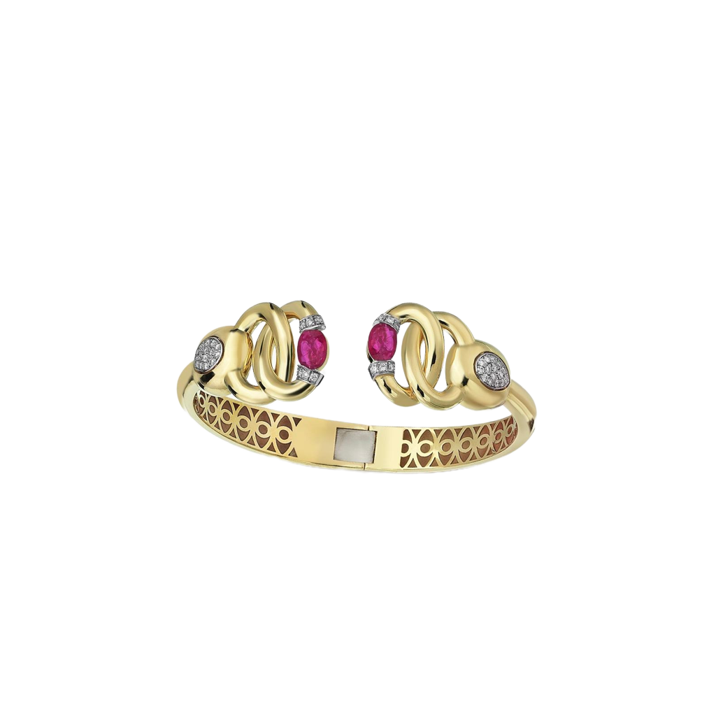 Gold tonlu zarif yapısı, birbirine geçmiş düğüm formundaki detayları ve merkezinde yer alan canlı kırmızı yakut taşlarıyla güçlü bir duruş sergiler. Pırlanta ışıltılı vurgular, tasarıma sofistike bir parıltı katarken, iç kısımdaki özel desen işçiliği ustalığı yansıtır. Scarlet Ties Kelepçe, zarafeti ve tutkuyu bileğinizde taşımak isteyenler için seçkin bir parçadır.
