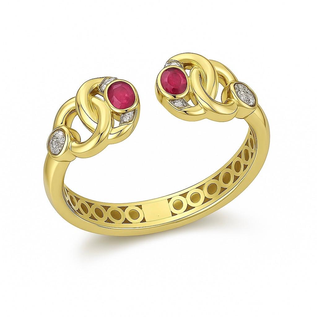 Gold tonlu zarif gövdesi, birbirine geçmiş düğüm formundaki detayları ve merkezinde yer alan canlı kırmızı yakut taşlarıyla tutkunun ve zarafetin birleşimini yansıtır. Pırlanta ışıltılı vurgular, tasarıma lüks bir parıltı katarken açık formu modern ve rahat bir kullanım sunar. Scarlet Ties Yüzük, güçlü ve sofistike bir stilin vazgeçilmez parçasıdır.