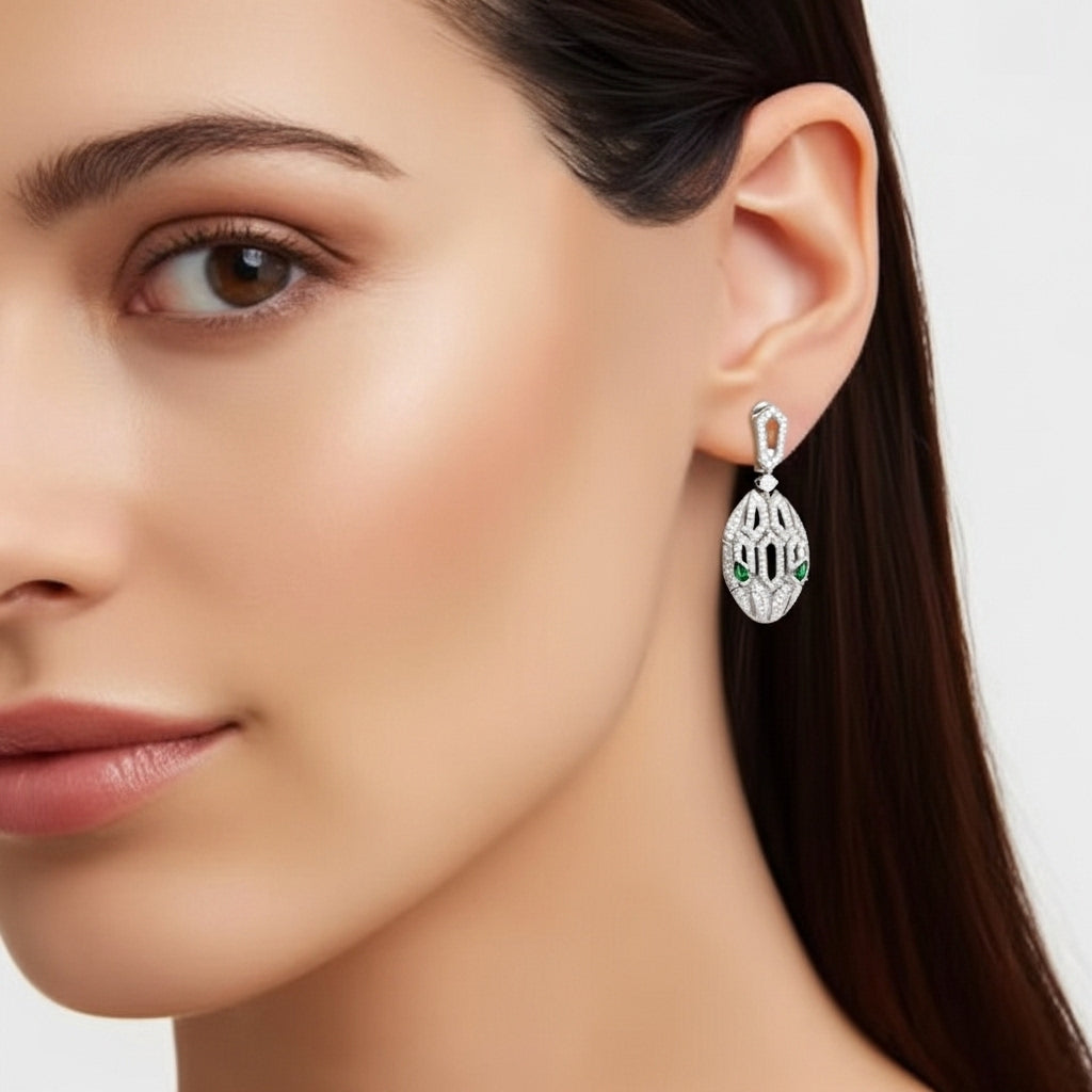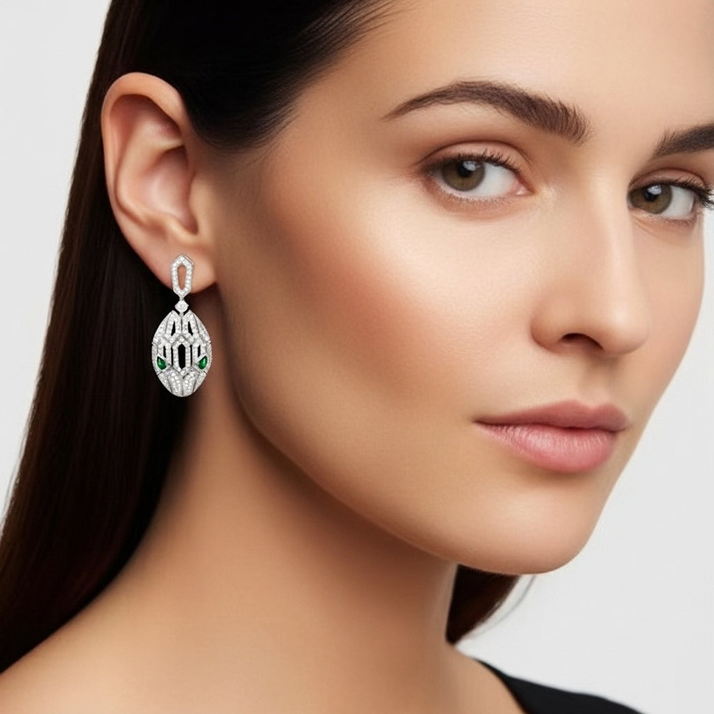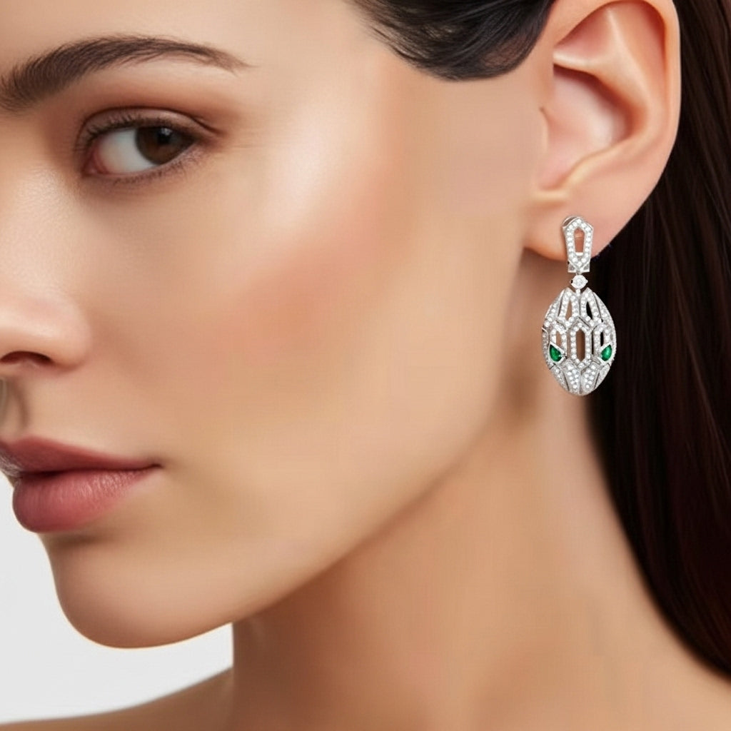 Serpentis Eye Küpe, gizem ve ihtişamı aynı anda yansıtan iddialı bir tasarım. Elmas işlemeli yüzeyinin ortasında yer alan zümrüt göz detayları, tasarıma hipnotik bir güç katarken, markanın cesur ve sofistike ruhunu öne çıkarıyor. Geometrik formun modern yorumu, klasik şıklığı çağdaş bir dokunuşla buluşturuyor.