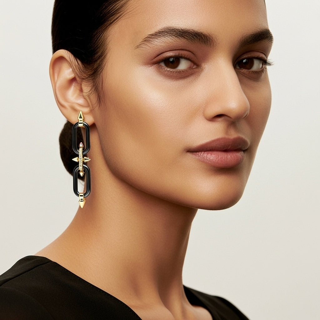 Siyah ve altının keskin kontrastından ilham alan Shadow Link Küpe, zincir formu ve sivri uç detaylarıyla güçlü bir karakter sergiler. Orta bölümdeki taş sırası, koyu tonların gizemini parlak bir ışıltıyla dengeler. Modern, iddialı ve özgün duruşuyla hem gündüz hem de gece stillerine çarpıcı bir dokunuş katar.