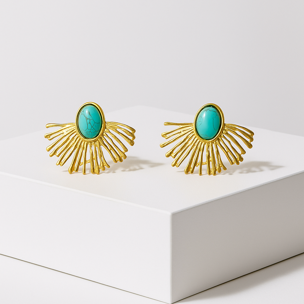 Gökyüzünün serin tonlarıyla altın ışıltısını buluşturan Skyline Charm Küpe, firuze taşının doğal enerjisini modern bir şıklıkla sunar. Hafif formu sayesinde gün boyu konfor sağlarken, zarif detaylarıyla her kombine sofistike bir dokunuş katar.