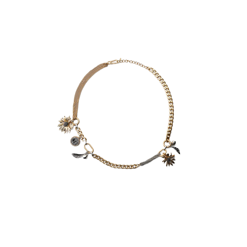 Güneşin ışıltısını ve doğanın zarafetini bir arada yansıtan bu özgün tasarım, altın zincir halkalarıyla modern bir görünüm sunarken, güneş figürleri ve yaprak detaylarıyla sıcak ve organik bir his uyandırır. İki farklı metal tonunun uyumu, tasarıma derinlik ve karakter katarken, asimetrik charm yerleşimleri kolyeye dinamik bir hava kazandırır. Sun & Leaf Kolye, hem gündelik kombinlerde enerjik bir dokunuş hem de özel davetlerde zarif bir vurgu için mükemmel bir seçimdir.