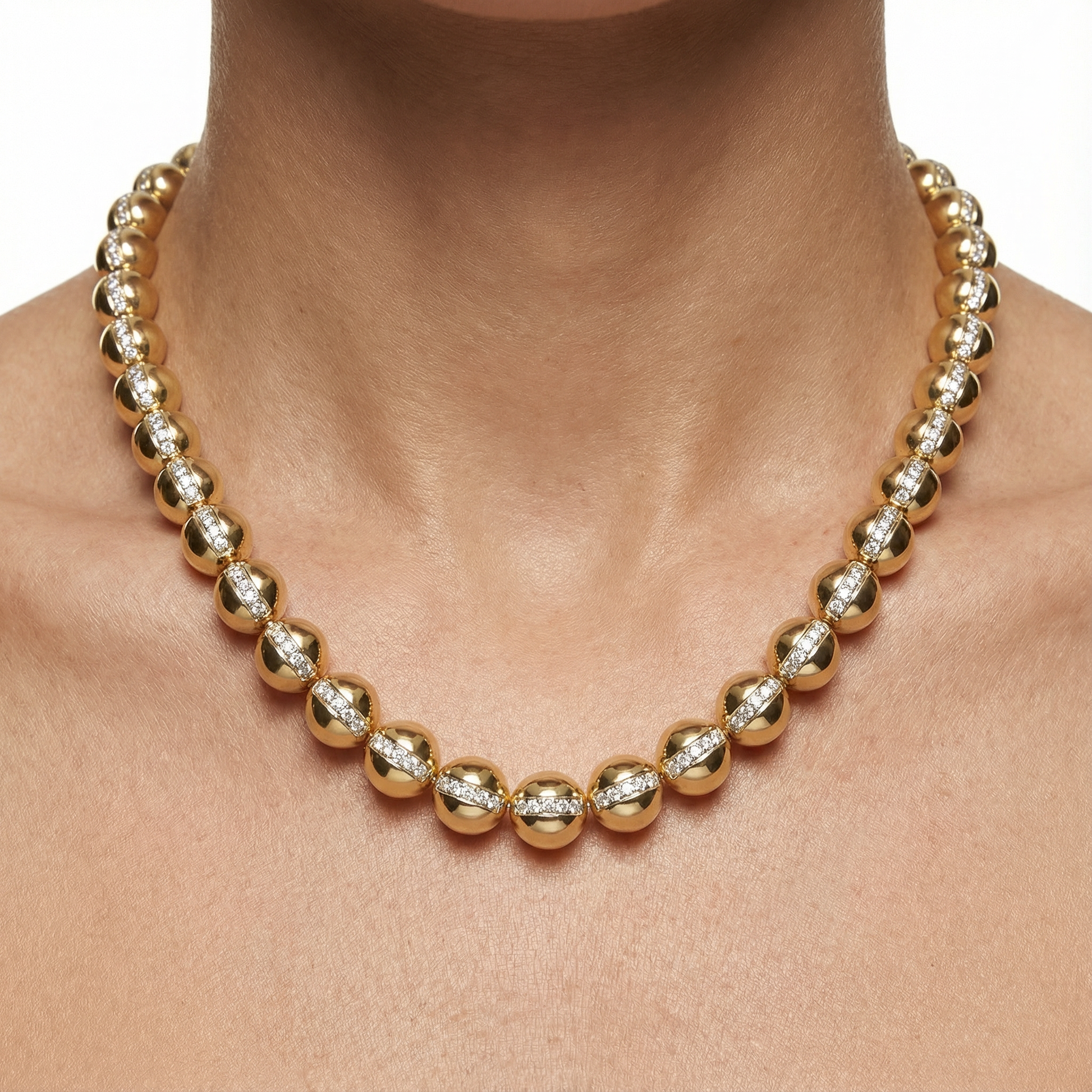 Each orb is bisected by a brilliant "diamond-belt" of pavé-set crystals, creating a continuous rhythmic flow of light that wraps around the neck. A contemporary and powerful reimagining of the traditional pearl strand, this piece balances substantial weight with refined elegance. It is designed to transform even the simplest silhouette into a high-fashion statement, reflecting a sense of status, strength, and sophisticated aesthetic taste.