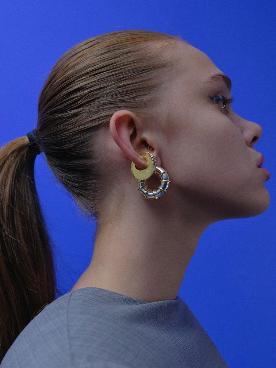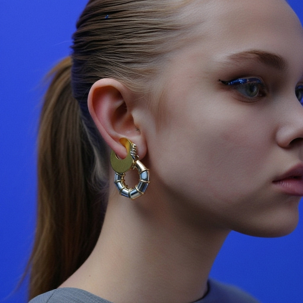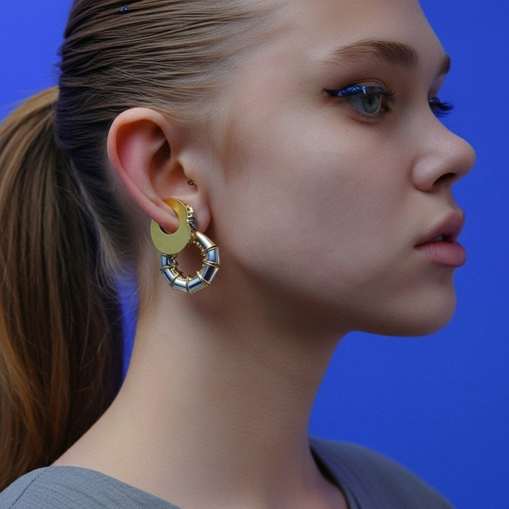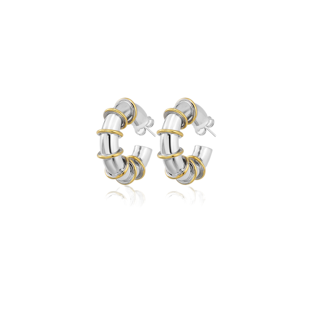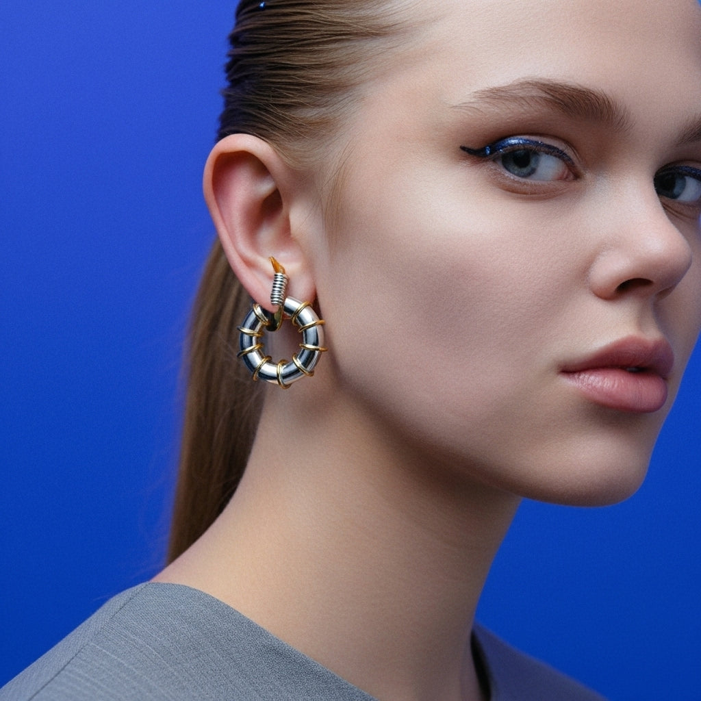 Gümüşün güçlü parlaklığı ile altının sıcak ışıltısını bir araya getiren Torque d’Argent Küpe, modern ve sofistike bir tasarım anlayışını yansıtır. Dinamik halkaların çevresini saran altın detaylar, güçlü bir kontrast yaratırken tasarıma mimari bir derinlik kazandırır. Günlük stilinizi yükseltmekten özel davetlerde fark yaratmaya kadar her anınıza eşlik edecek bu küpe, zamansız bir şıklığın ifadesidir.