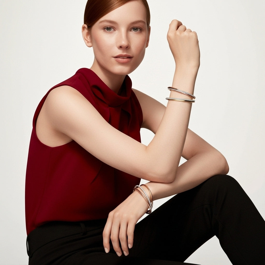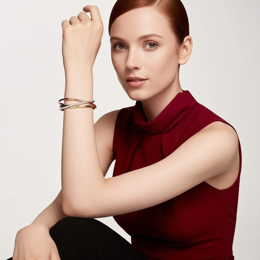 Üç rengin zamansız uyumunu yansıtan TriAura Bileklik, sarı altın, beyaz altın ve rose gold tonlarının kusursuz birleşimiyle tasarlandı. Pırlanta detaylarıyla zenginleştirilen bu zarif tasarım, ışığı her açıdan yansıtarak sofistike bir ışıltı sunar. Hem günlük şıklıkta hem de özel davetlerde zarafeti ön plana çıkaran seçkin bir parçadır.