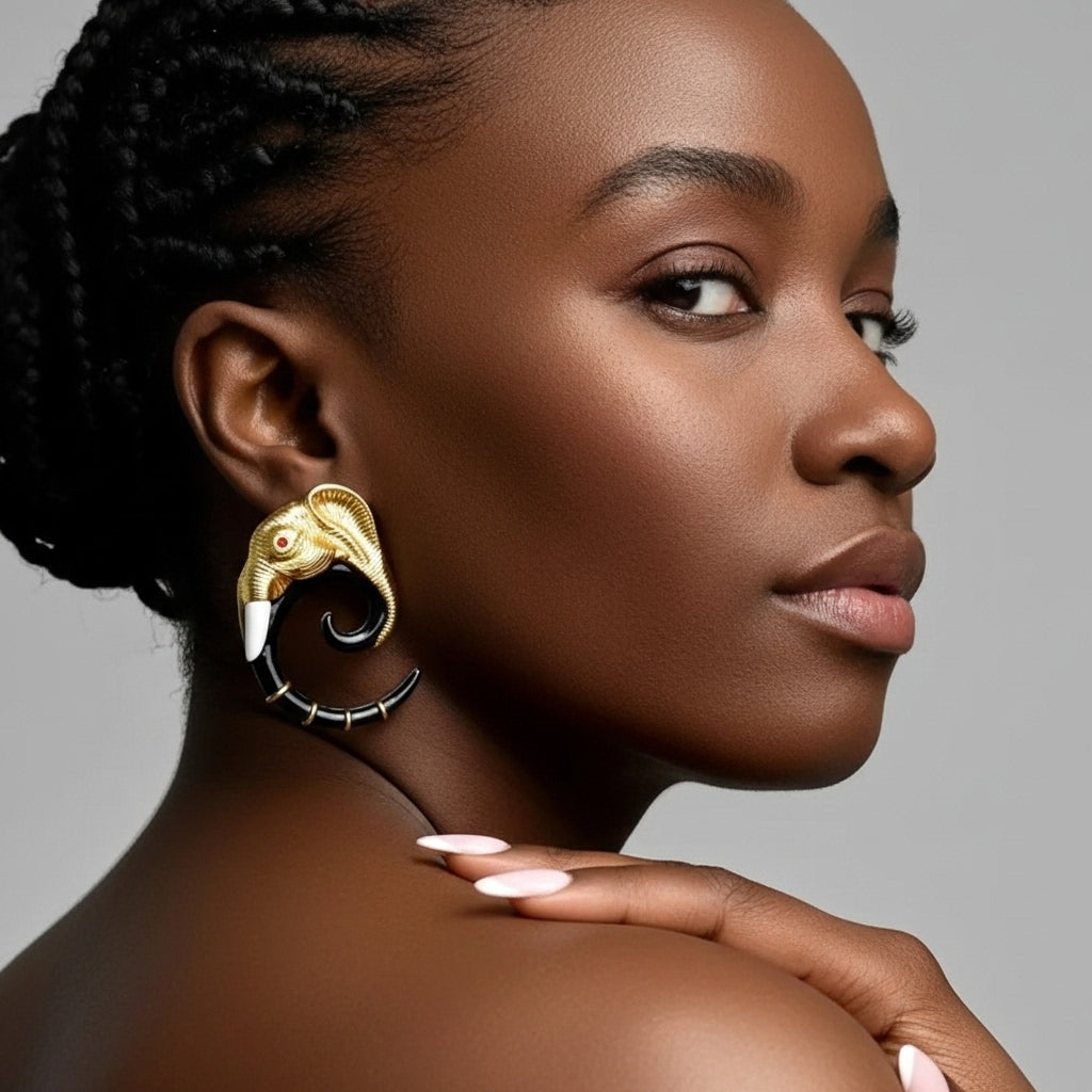 Tuskaar Küpe, gücün ve zarafetin kusursuz bir birleşimi. Altın rengindeki fil başı motifi, bilgeliği ve korumayı temsil ederken, spiral formu döngüsel yaşamı ve sürekli yenilenmeyi simgeliyor. Siyah detaylar tasarıma derinlik ve mistik bir aura katarken, beyaz diş formları güçlü bir kontrast yaratarak dikkat çekici bir görünüm oluşturur.
