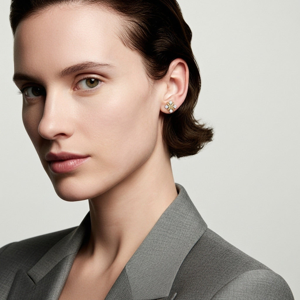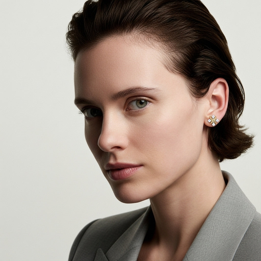 Vega Knot Küpe, gökyüzünün en parlak yıldızlarından Vega’nın ışıltısını modern bir düğüm formuyla birleştiriyor. Altın tonların zarif kesişimi, dört yöne doğru uzanan pırlanta detaylarla güçlendirilerek zamansız bir ışık saçıyor. Hem gündüz hem gece kullanıma uygun olan bu tasarım, minimalizmin gücünü göksel bir ihtişamla buluşturuyor.