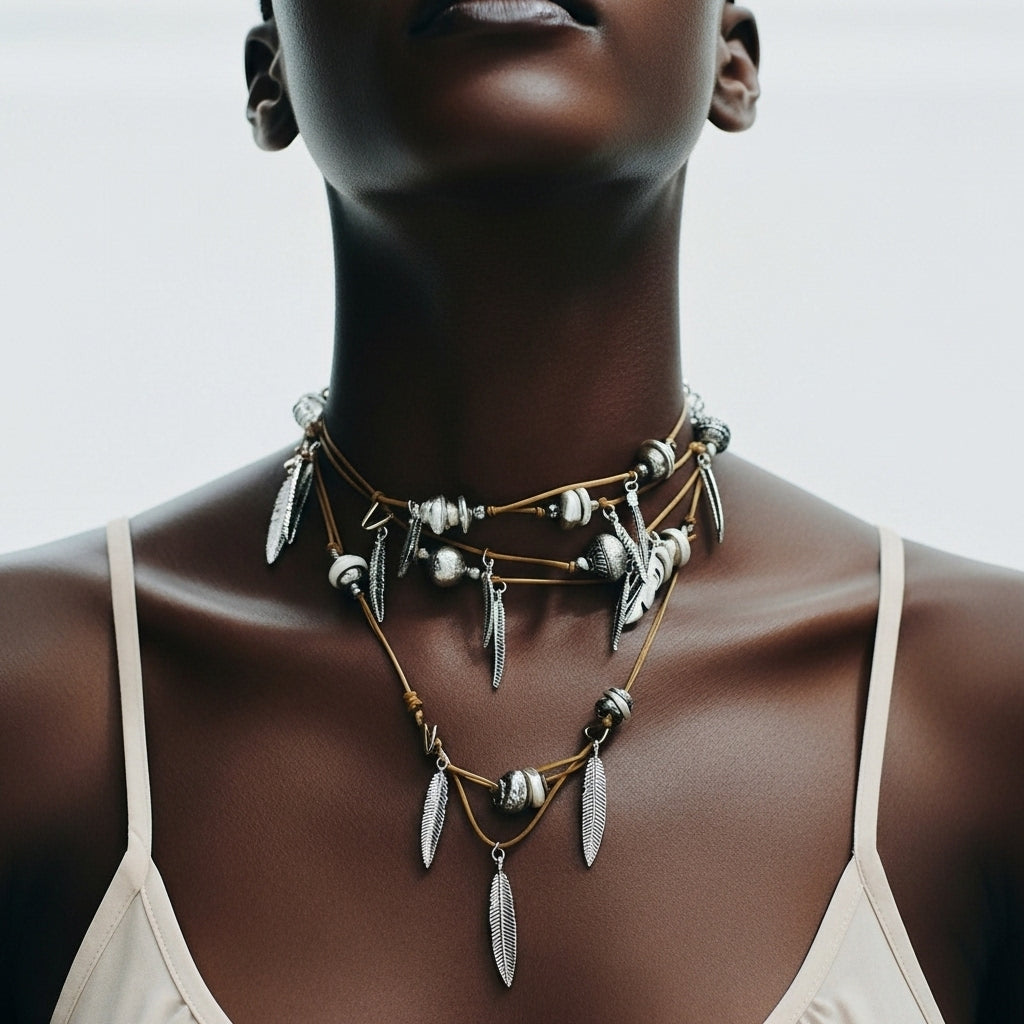 Velora Featherline Kolye, özgürlüğün simgesi tüy detaylarını zarif bir akışla bir araya getiren özel bir tasarım. Kahverengi ip ve gümüş tonlarının kontrastı, bohem şıklığı modern bir dokunuşla buluşturur.