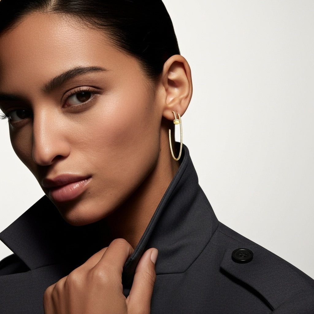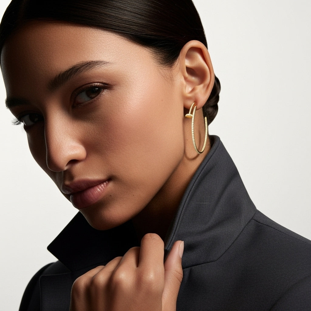 Klasik halka formunu cesur bir yorumla yeniden tanımlayan Voltare Hoop, modern zarafetin simgesi. Altın tonun ışıltısını saran ince pırlanta dokunuşları, her hareketle göz kamaştırıcı bir parıltı yaratır. Minimal çizgiler ile güçlü bir formun buluştuğu bu tasarım, gündüzden geceye stilinizi yükselten zamansız bir parça.