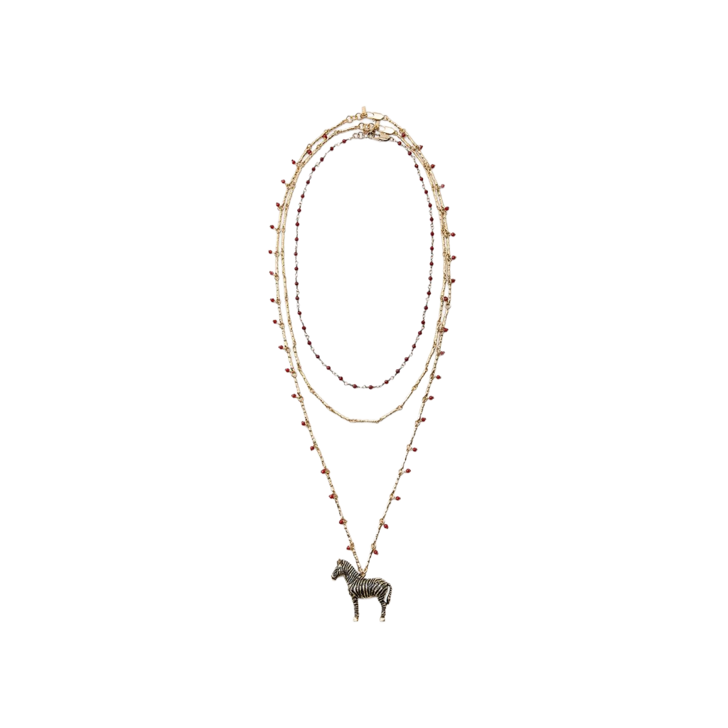 Katmanlı altın tonları, zarif kırmızı boncuk detayları ve merkezde yer alan zebra figürüyle Afrika’nın vahşi doğasının zarafetini yansıtır. Doğanın ilk ışıklarında uyanan savanaların sıcak ruhunu, modern bir takı estetiğiyle buluşturur. Hafif yapısı ve çok yönlü tasarımıyla ister günlük stilinize, ister özel bir kombinize özgün ve dikkat çekici bir dokunuş katar.