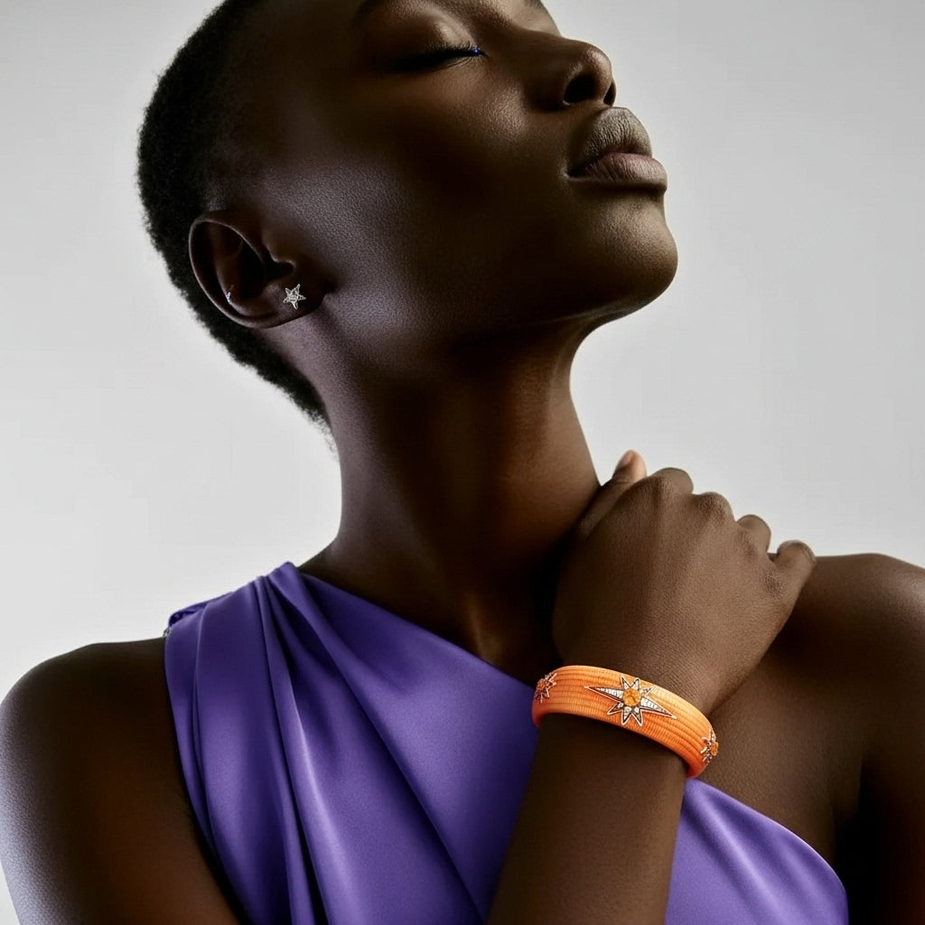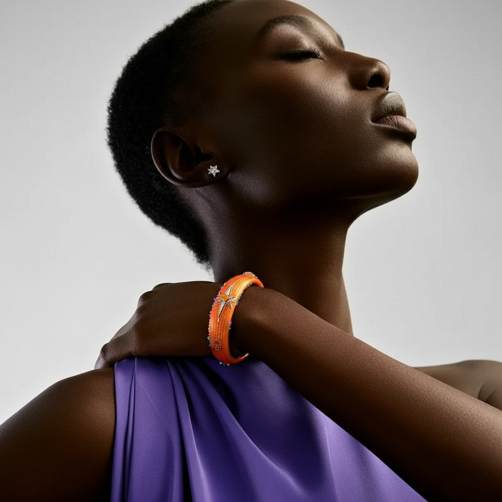 Gökyüzünün ışıltısını ve amberin sıcak enerjisini bir araya getiren bu özel kelepçe, yıldız patlamalarını andıran tasarımıyla zamansız bir şıklık sunar. Parlak taş detayları ve modern dokusu, hem gündüz hem gece stiline cesur bir imza atar. Limitli sayıda üretilen Amber Nova, sıradan takıların ötesinde bir göksel yolculuğu bileğine taşır.