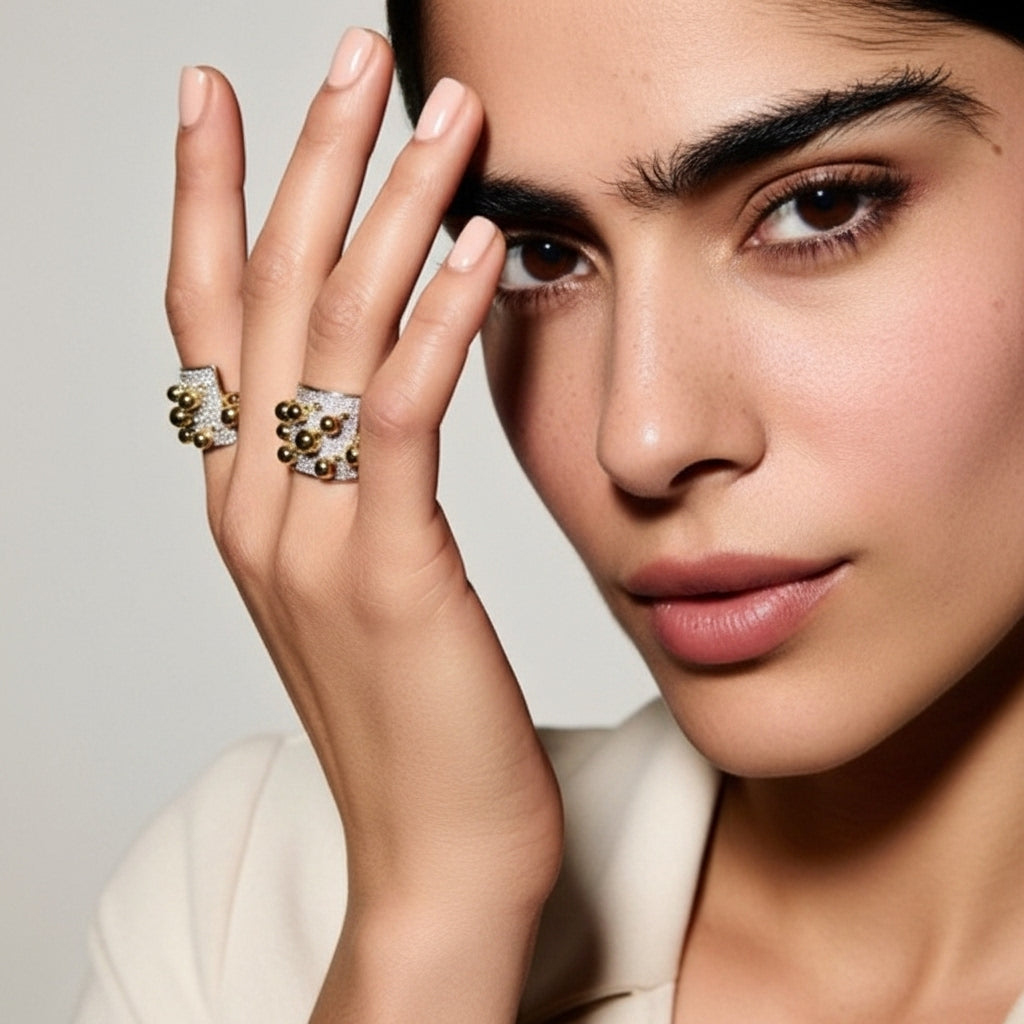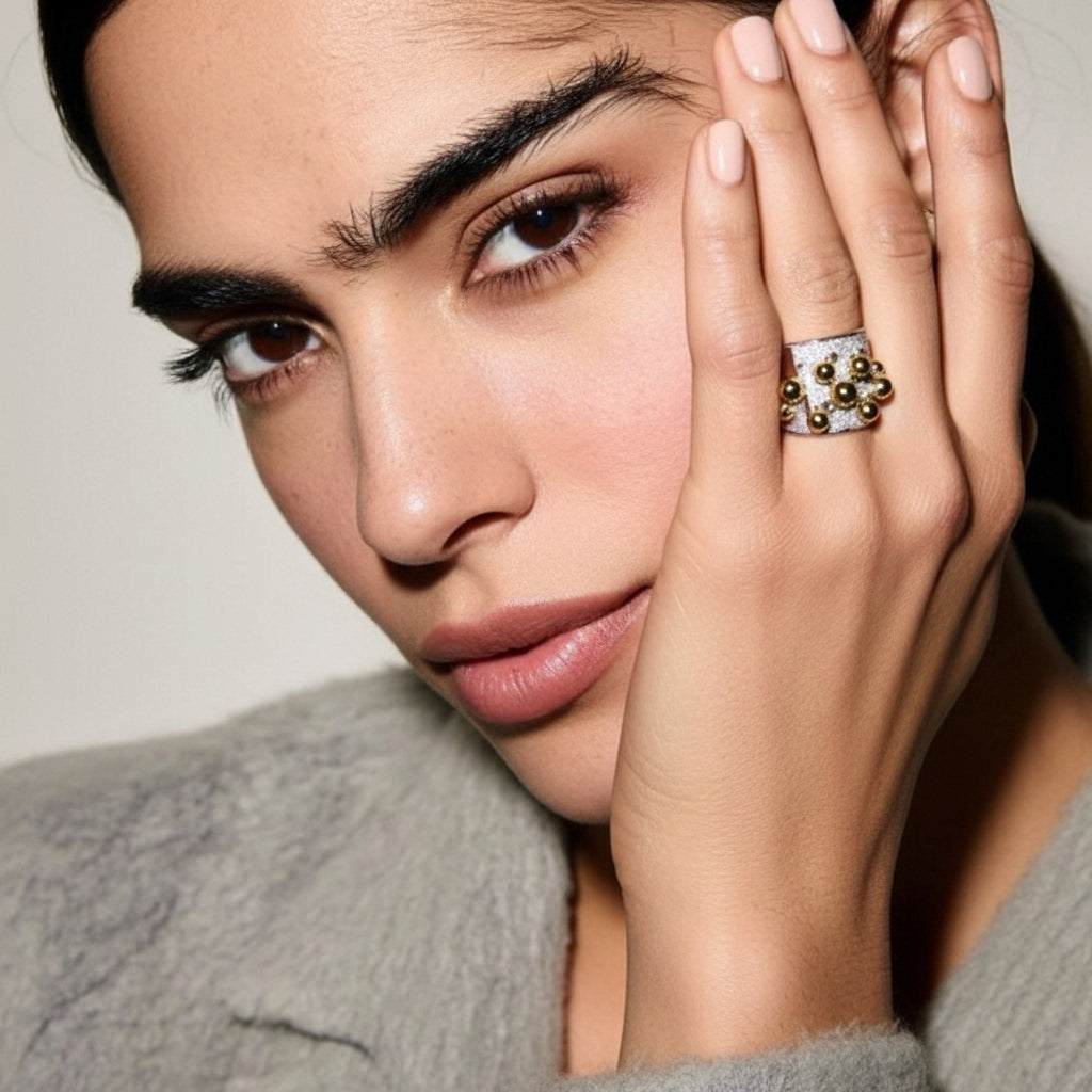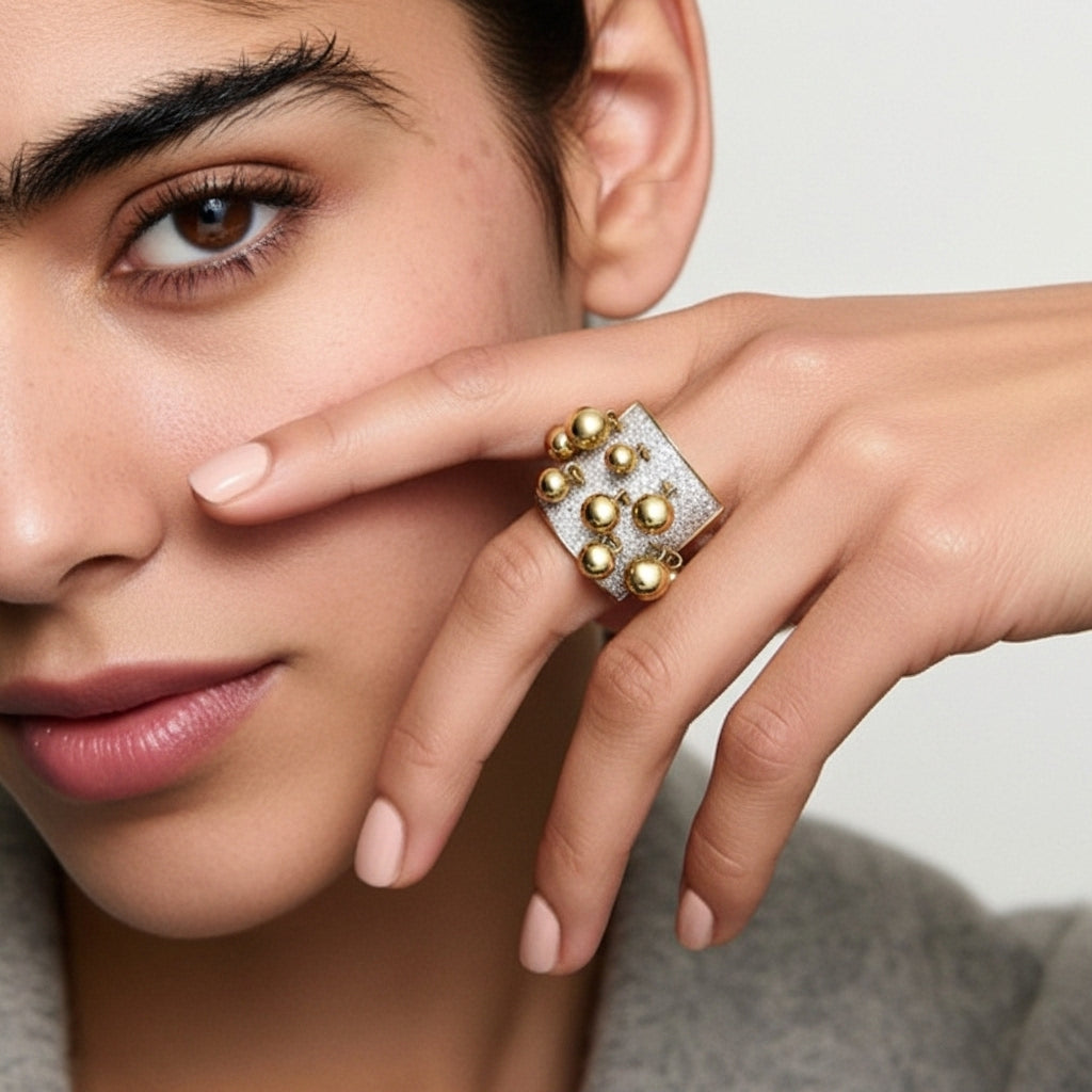 Ambrosé Yüzük, altın kürelerin dansını andıran cesur tasarımı ve ışıltılı taşlarla bezenmiş yüzeyiyle adeta modern bir heykel gibi tasarlandı. Parlak altın küreler, her hareketinizde ışıltı saçarak dikkat çeken bir enerji yaratır.