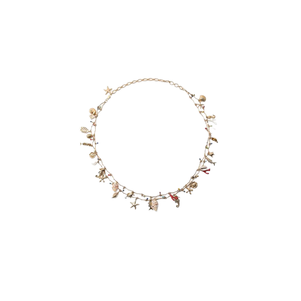 Deniz kabukları, denizyıldızları, mercanlar ve küçük deniz temalı figürlerle süslenmiş bu zarif tasarım, sahil yürüyüşlerinde toplanan küçük hazineleri anımsatır. İnce zincir üzerine asimetrik olarak yerleştirilmiş detaylar, kolyeye hem hareket hem de doğal bir akış katar. Beachcomber Kolye, yaz tatillerinden şehirdeki gündelik şıklığa kadar her kombine hafif, neşeli ve deniz esintili bir dokunuş getirir.