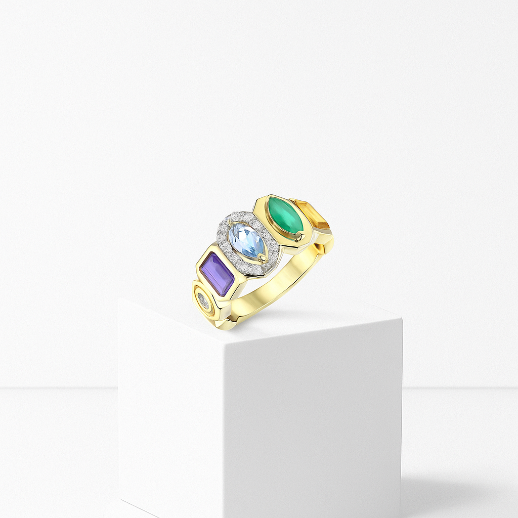 Her bir taş; mavinin huzuru, yeşilin dengesi, morun asaleti ve sarının sıcaklığıyla duyguları yansıtırken, altın kaplama gövde bu renkleri zarif bir çerçeveye oturtur. Asimetrik gibi görünen ama bilinçli şekilde inşa edilmiş bu form, yüzüğü hem çağdaş hem zamansız kılar.