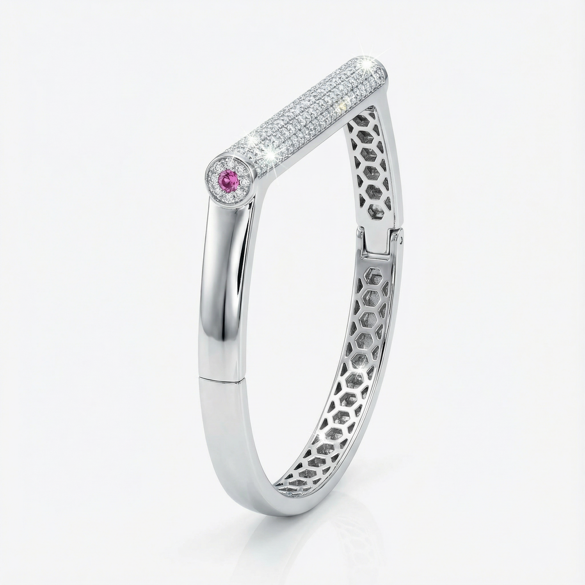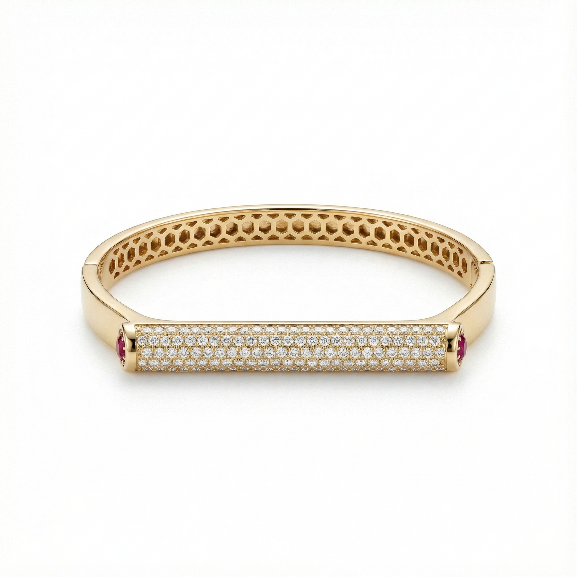 This architectural centerpiece is flanked by two deep-ruby accents, providing a subtle yet powerful splash of color that defines the piece's "Luxury-Edge" aesthetic. The interior of the bangle reveals a hidden masterwork: a precision-engineered honeycomb lattice that ensures both structural integrity and a lightweight, breathable feel on the wrist. With its high-polish gold finish and seamless hinge closure, the Crystalline Pillar Bracelet is designed for the modern vanguard who appreciates beauty that is as complex on the inside as it is radiant on the outside.