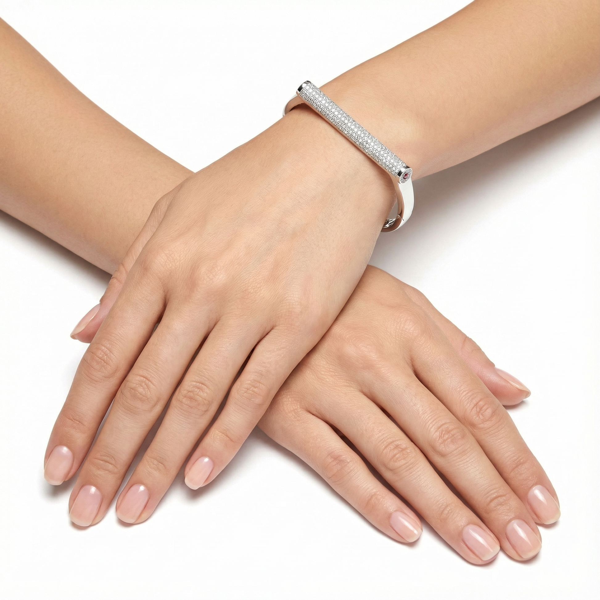 The Crystalline Pillar Bracelet is a sophisticated fusion of industrial structure and high-jewelry refinement. Centered by a formidable "pillar" of light, the bangle features a dense, multi-row pavé setting of brilliant-cut crystals that capture and amplify light with every movement.