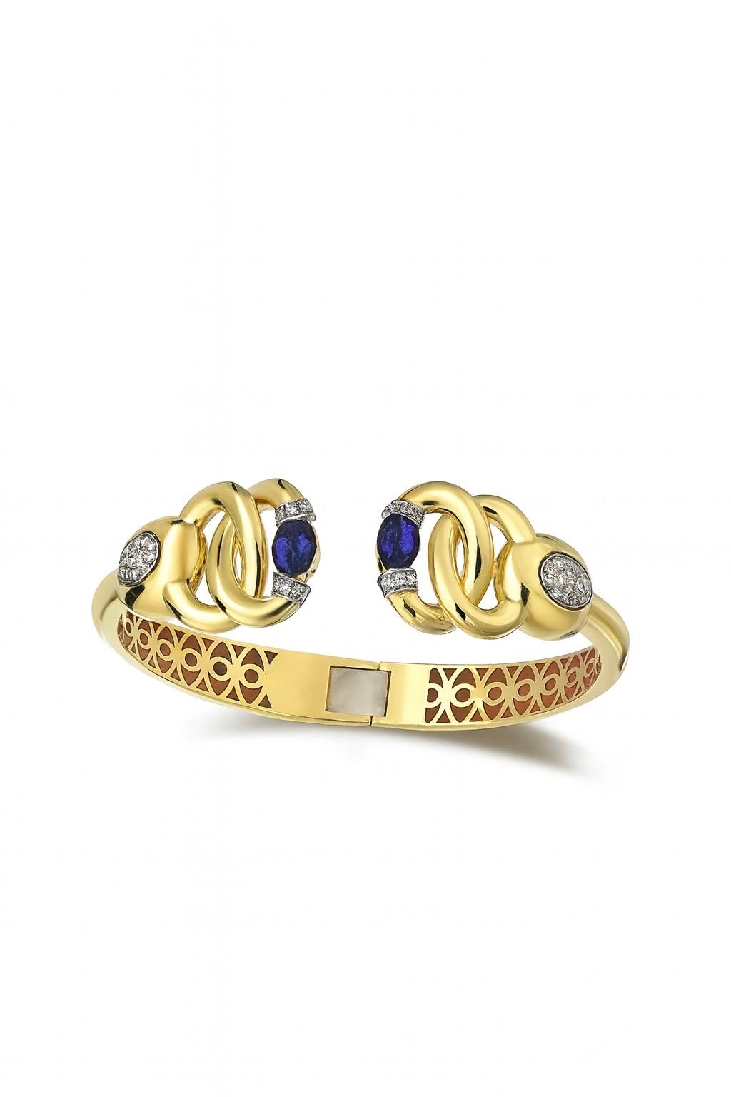 Gold tonlu zarif yapısı, birbirine geçmiş düğüm formundaki detayları ve mavi safir taş süslemeleriyle lüks bir görünüm sunar. Pırlanta ışıltılı vurgular, tasarıma sofistike bir parıltı katarken, iç kısımdaki özel desen işçiliği ince bir ustalık gösterir. Elegant Knot Kelepçe, hem klasik hem de modern tarzlara uyum sağlayan seçkin bir parçadır.