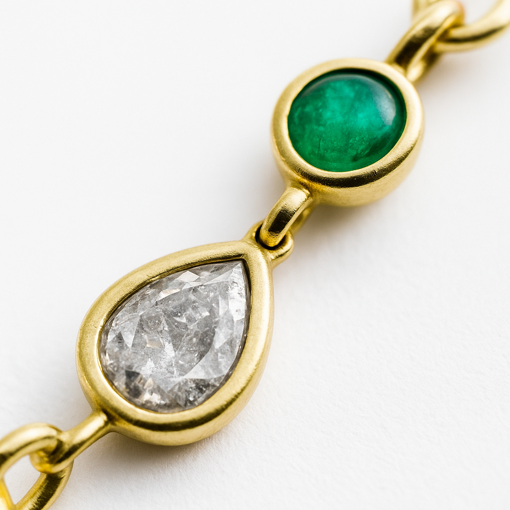 Göz alıcı damla kesimli taşların ritmik dizilimi, kolyenin boynunuzda doğal bir kavisle süzülmesini sağlar. Bu akıcı form, ışıltılı detaylarla birleşerek hem gündüz sadeliğine hem de gece şıklığına uyum sağlar.