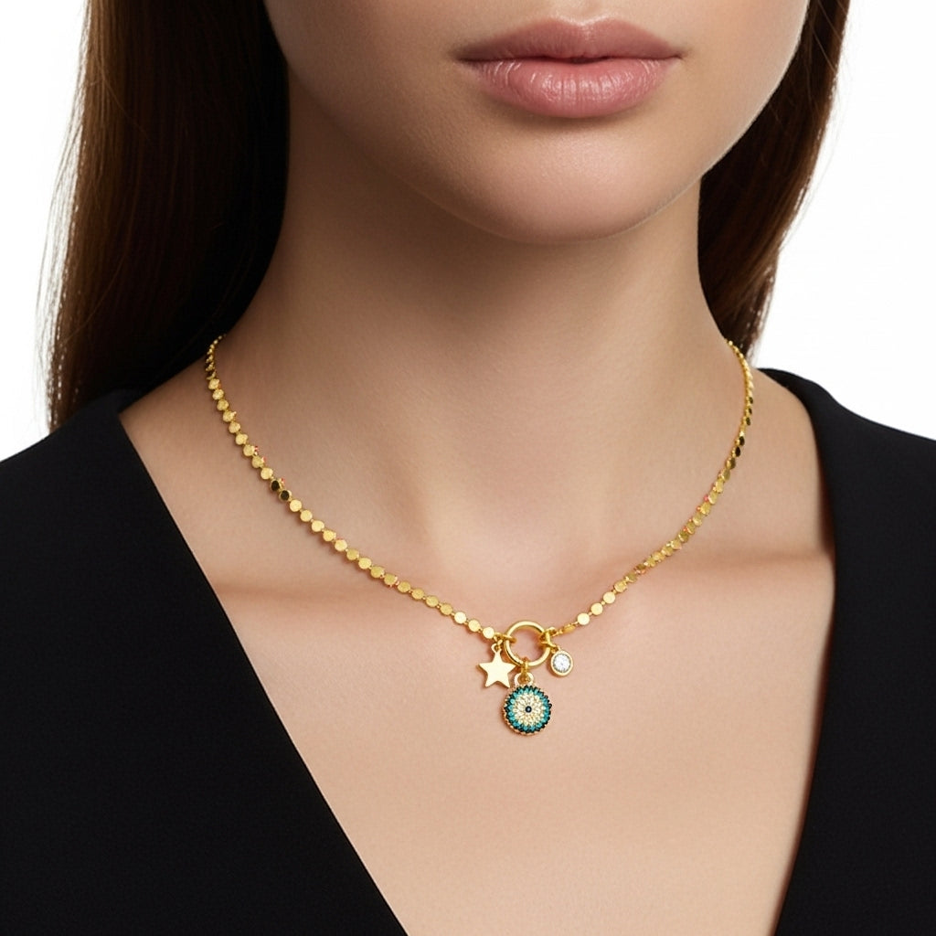 Elysian Dot Kolye, küçük yuvarlak zincir yapısı ve sembolik charm’ları ile feminen bir zarafet sunar. Nazar boncuğu esintili yuvarlak charm, yıldız ve ışıltılı taş detayıyla birleşerek şık ve anlamlı bir bütünlük oluşturur.