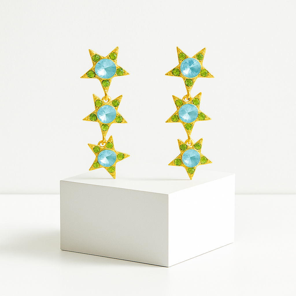 Üç kademeli yıldız formu, merkezde buz mavisi kristallerle ışığı yakalar; çevresini saran lime yeşili taşlar ise tasarıma canlı bir enerji katar. Altın kaplama hafif gövde, ince bağlantılar sayesinde her adımda ritmik bir salınım yaratır. Gündüz sade bir gömlekle ferah bir vurgu, gece saten elbiseyle ışığı sahneye taşır. Bu parça, taze kontrastıyla stiline anında premium bir dokunuş ekler.