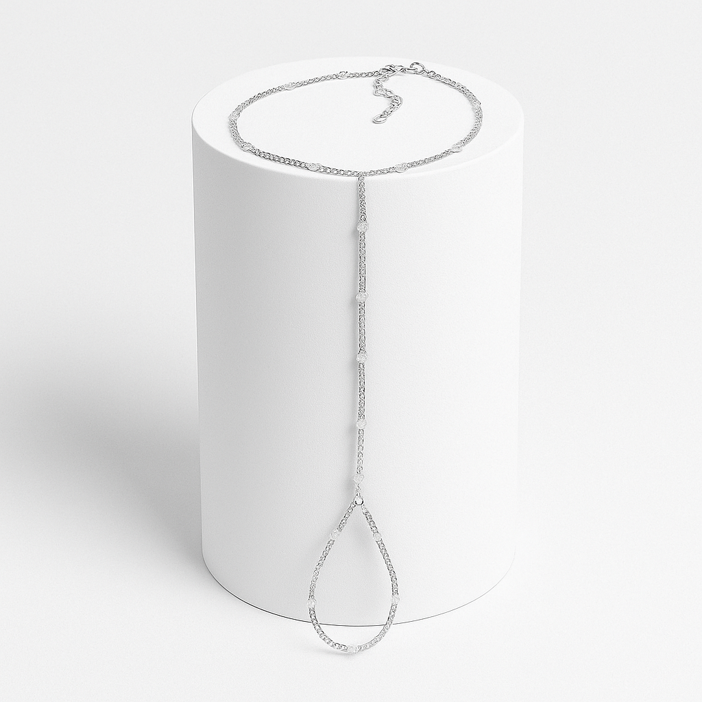 İnce gümüş zincirin üzerine serpiştirilen buz kristali formundaki mikro boncuklar, elinizde donuk bir akarsu misali akarken ışığı kırarak soğuk bir parıltı yayar; her adımda titreyen yansımalar sessiz bir ihtişam hissi yaratır. Dikey hat, bilekten parmak halkasına kadar kesintisiz bir siluet çizer ve doğal el hareketlerinize uyum sağlayarak ağırlıksız bir konfor sunar. Ayarlanabilir kilit detayı farklı bilek ölçülerine kusursuzca uyarken, zincirin fasetli yüzeyi zarif bir buz taneleri efekti üretir. Glacial Chainflow, fazlalıktan arınmış modern lüksü soğuk ay ışığıyla buluşturur; ister ipek bir elbisenin tek göz alıcı detayı, ister günlük stile sofistike bir dokunuş olarak, iddiasını fısıldayarak gösterir.