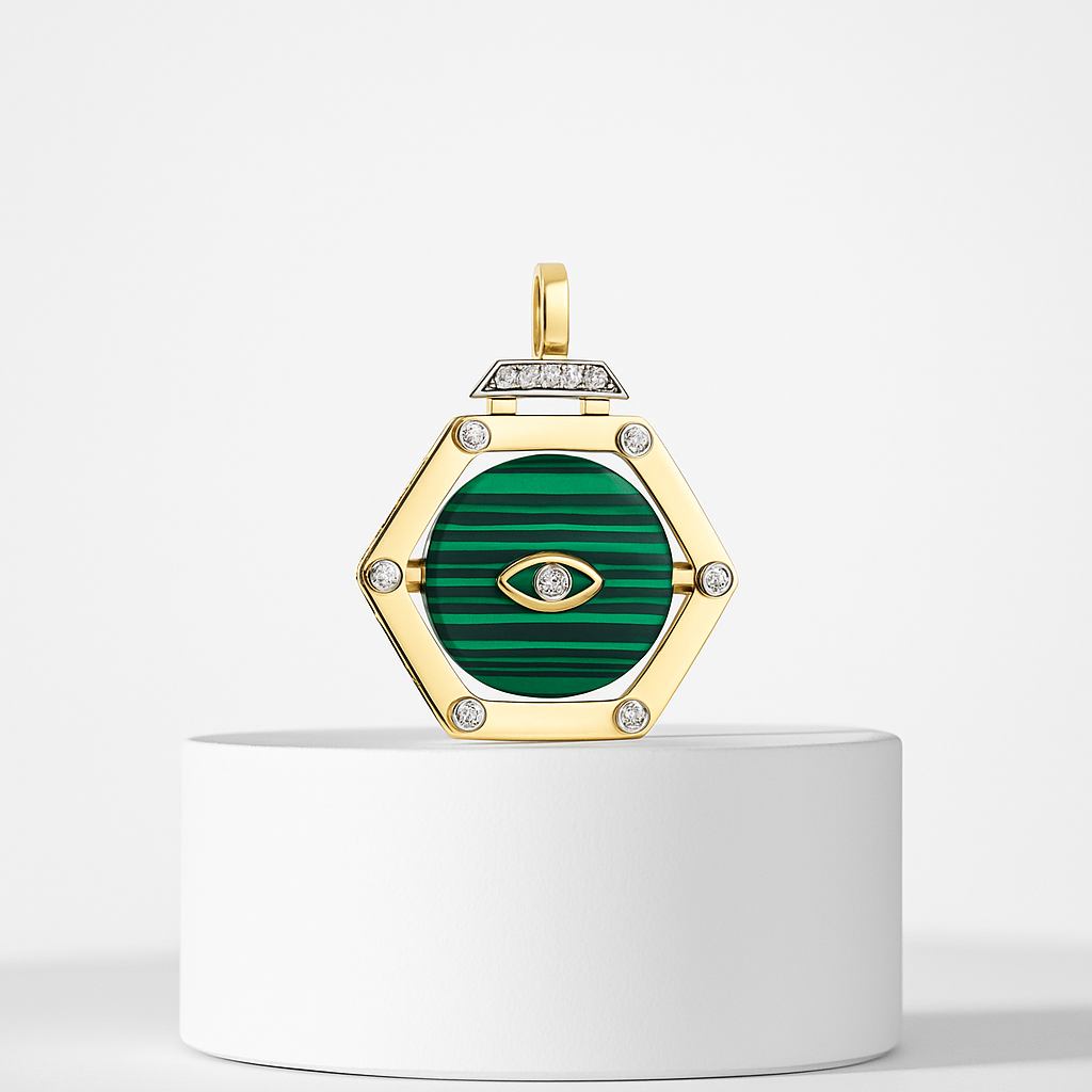 Altın çerçeve içinde yer alan altıgen formu, zarif malakit taşının yeşil tonlarıyla buluşarak modern ve güçlü bir estetik sunar. Ortasında yer alan göz motifi, şans ve koruma sembolü olarak tasarıma mistik bir anlam katar. Parlak taş detayları, kolyeye lüks bir ışıltı kazandırırken, geometrik hatlarıyla hem çağdaş hem de zamansız bir stil yaratır. Lucky Hexagon Kolye, şıklığına anlam ve enerji katmak isteyenler için özel bir parçadır.