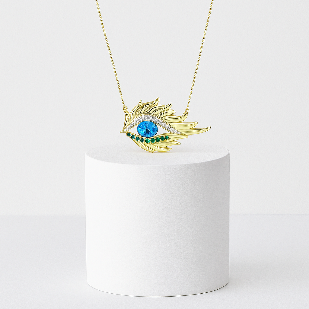 Lumia Eye Kolye, mistik sembolizm ile çağdaş tasarımın çarpıcı bir birleşimidir. Göz formunun merkezinde yer alan canlı mavi taş, içsel netliği ve sezgisel gücü simgelerken; çevresini saran alev benzeri kıvrımlar, koruyucu bir enerji ve dikkat çekici bir dinamizm yaratır. Üstteki ışık hatları ışıltıyı zarifçe yansıtırken, alt kısımdaki zümrüt tonlar tasarıma sofistike bir renk dengesi katıyor.