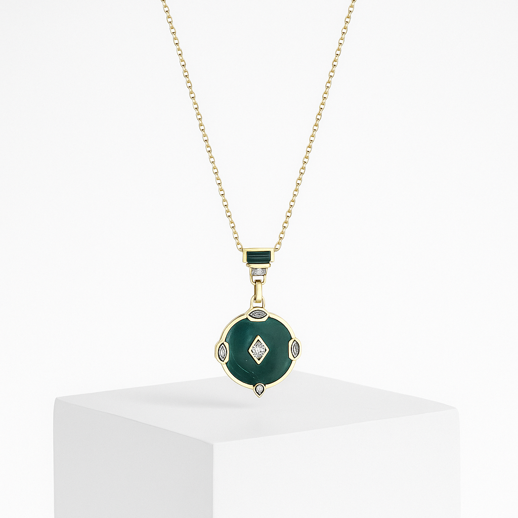 Doğanın gücünden ilham alarak tasarlanan Malachite Kolye, onun anınıza derinliği ve zarafet katmak için özel olarak yaratıldı. Yeşil tonlarının büyüleyici güzelliği ve şık tasarımıyla dikkat ederek bu kolye, zarif eserleri ve eşsiz dokusu ile stilinizi öne çıkarır. Hem günlük kullanımda hem de özel davetlerde tarzınızı mükemmel bir şekilde tamamlayarak giydiğiniz şıklığınızı yansıtıyor.