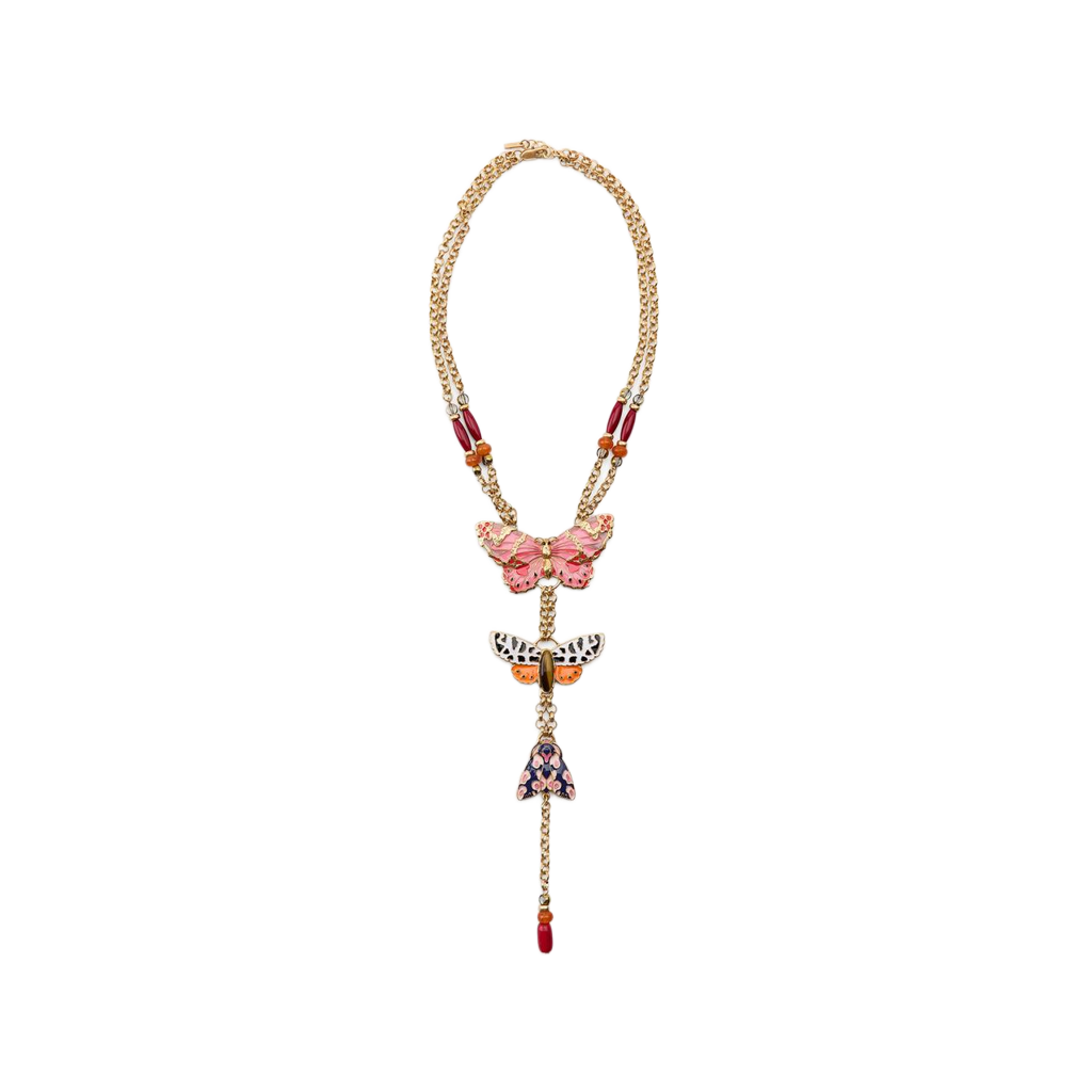 Dönüşümün büyüleyici simgesini zarif bir tasarımla buluşturan Metamorph Kolye, kelebek ve böcek motifleriyle yaşamın sürekli değişimini temsil eder. Canlı renklerin enerjisi altın zincirle birleşerek sanatsal bir duruş sunar. Hem özgün tarzıyla dikkat çekmek isteyenler hem de zarif bir imza parçası arayanlar için kusursuz bir seçimdir.