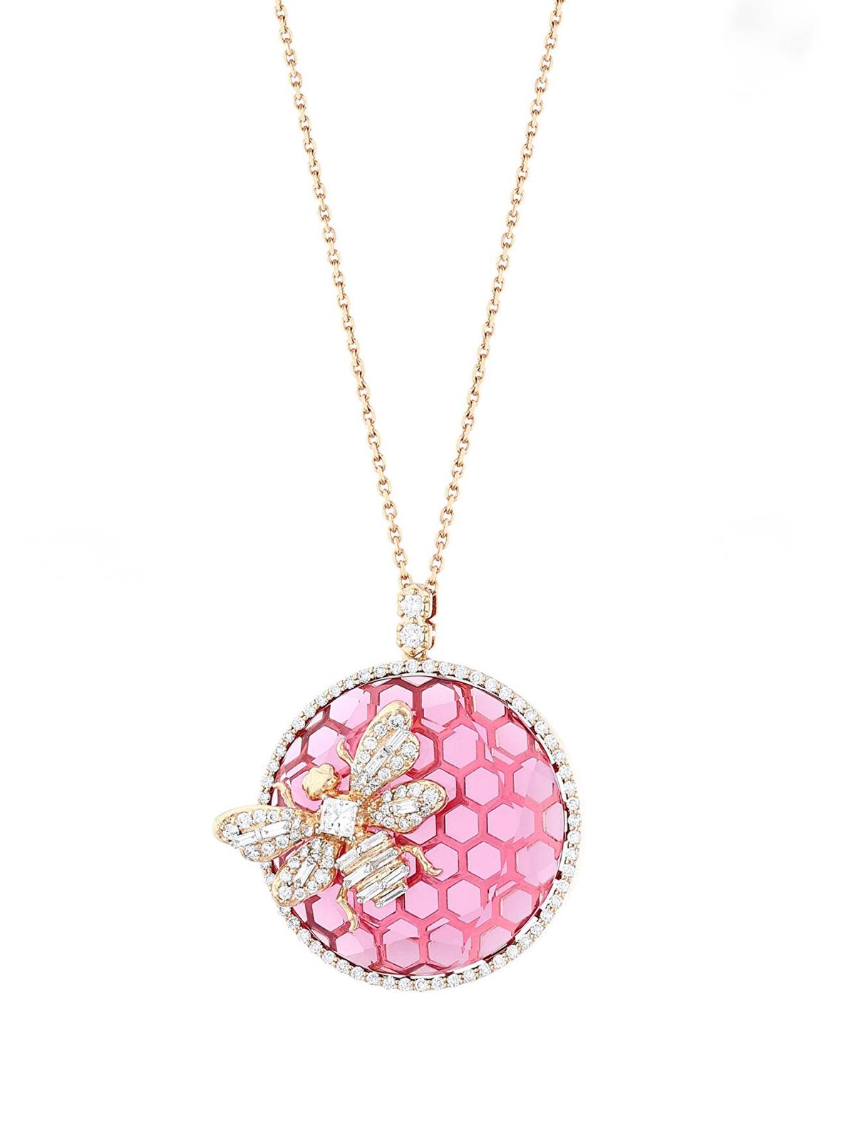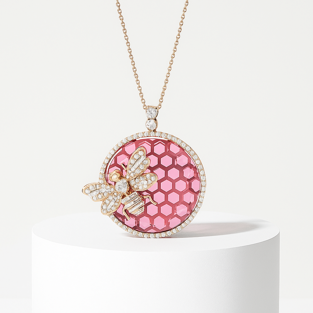 Zarif pembe tonlarının ışıltılı taşlarla buluştuğu bu tasarım, bal peteği deseninin feminen ve modern yorumunu sunar. Üzerindeki taş detaylı arı motifi, doğanın zarafetini ve canlılığını simgelerken, pembe arka plan tasarıma romantik bir dokunuş katar. İnce zinciri ve göz alıcı sarkıt formu sayesinde hem günlük stilinize zarif bir ışıltı katmak hem de özel davetlerde dikkat çekici bir görünüm yaratmak için ideal bir parçadır.