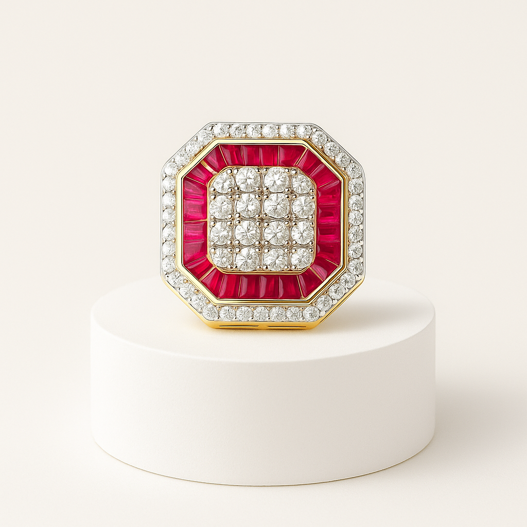 Yakut kırmızısının büyüleyici derinliği, pırlantanın zamansız ışıltısıyla buluşuyor. Katman katman örülmüş sekizgen formlu bu tasarım, hem tarihî bir zenginliği hem de çağdaş bir ihtişamı simgeliyor. Ortadaki simetrik pırlanta dizilimi; her bakışta başka bir ışık yansıtırken, etrafını çevreleyen yakutlar bu ışığı tutkulu bir sıcaklığa dönüştürüyor.