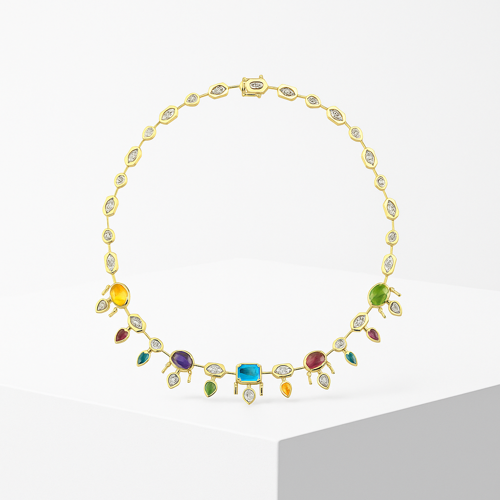 Solara Color Kolye, birden fazla rengin zarif uyumunu modern bir tasarımla buluşturuyor. Canlı tonlardaki taş detayları, her ortamda dikkat çekici ve enerjik bir görünüm sağlar. Özenli işçilik ve kaliteli malzeme kullanımı sayesinde hem günlük kombinerinizde hem de özel davetlerde stilinizi öne çıkaran, uzun ömürlü bir aksesuardır.