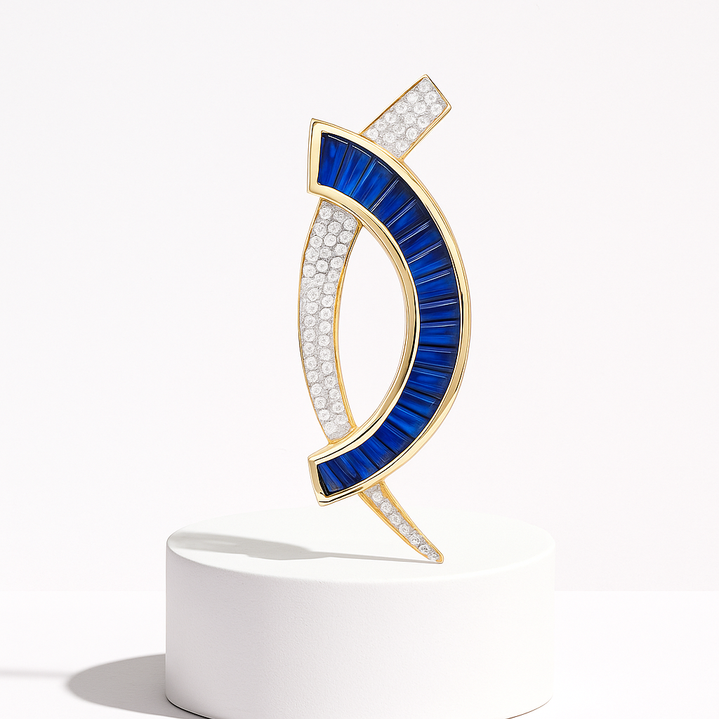 Derin safir tonları, gece göğünün sonsuzluğunu yansıtırken; parlak taşlarla bezeli altın hatlar, yıldız ışığının zarif bir yansıması gibi tasarlandı. Eğrisel formu, hem güçlü bir silüet yaratır hem de kulağa oturduğunda heykelsi bir duruş kazandırır. Her hareketinizde ışığı başka bir şekilde yakalar; her bakışta farklı bir detay ortaya çıkar.